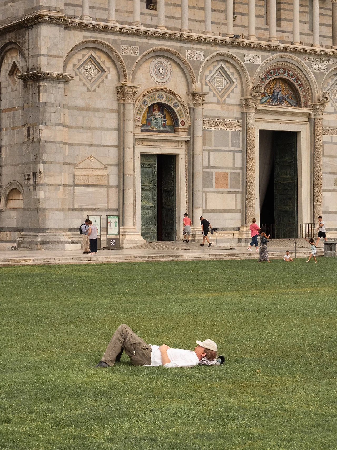 '피사의 사탑'을 방문하는 관광객들이 꼭 찍는 사진 구도가 있다. 원근법을 활용해 기울어진 사탑을 밑에서 손으로 받치고 있거나, 밀고 있는 포즈를 취하는 등 가지각색의 익살스러운 구도다. 사탑 근처에는 사진을 찍는 사람들이 줄지어 이어져 있으며, 멀리서 응시할 때 수많은 사람들이 모두 같은 포즈를 취하고 있는 묘한 광경을 볼 수 있다. 그 와중 유쾌한 장난도 자주 목격할 수 있었다. 어떤 이는 사탑을 손으로 받치는 듯한 포즈의 관광객 사이로 지나가며 포즈를 취하고 있는 사람과 갑자기 하이파이브하는 우스운 광경도 있었다. 많은 관광객들이 국적 불문하고 랜드마크 관광지 안에서 하나가 되고 어떠한 교감을 하는 모습이 마냥 신기하게 다가왔다.
