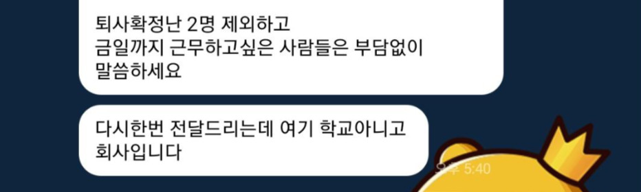 라는 문장으로 시작된 점장이 보낸 장문의 카톡 메시지의 내용을 함축하면 이러했다. 본인은 여러 사람들의 뜻을 최대한 수용해 주려고 노력했다. 하지만 그럼에도 불구하고 불만이 많은 사람은 더 이상 함께 하고 싶지 않으니 더 좋은 곳 가서 일하시길 바란다. 퇴사 확정난 두 명 제외하고 오늘까지만 일하고 싶은 직원이 더 있다면 언제든 와서 이야기해달라. 이곳은 학교가 아니라 직장인 것 잊지 말아라.