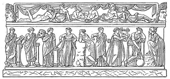 왼쪽부터: 멜포메네(비극), 에라토(독창), 에우테르페(서정시), 우라니아(천문), 칼리오페(서사시), 클레이오(역사), 탈리아(희극), 테르프시코레(합창, 가무) 폴리힘니아(찬가)