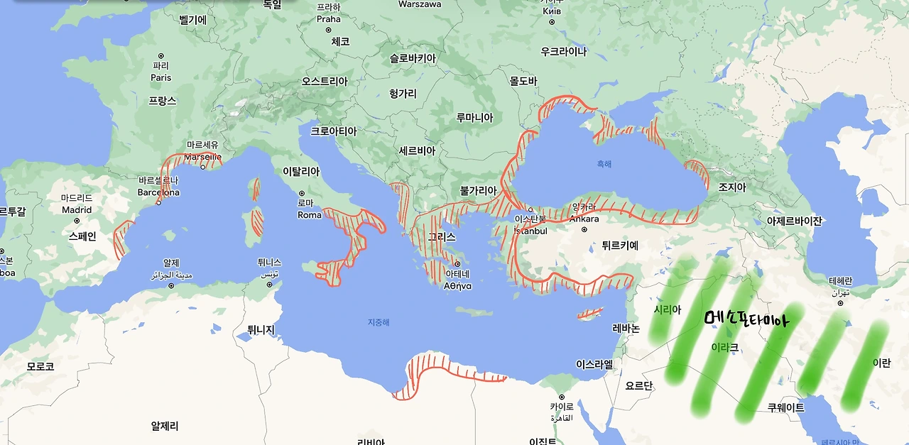 위에 표시한 영역은 550년경 그리스 점령지이다. 굉장히 드문드문 퍼져있어 이동하려면 시간이 꽤나 걸렸겠다는 생각이 든다.(ㅋㅋ) 메소포타미아는 이미 없던 시기이지만 이해를 위해 대략적으로 함께 표시해 보았다. 고대 그리스 하면 떠오르는 인물들이 여럿 있는데 그중 가장 먼저 떠오르는 사람은 아무래도 ‘피타고라스’ 일 것이다. 모든 지식의 근원인 그는 그리스 전체 시기중 중간인 기원전 570년경에 태어났다. 여기서 한 가지 의문이 든다. 피타고라스 이전에는 아무런 지식활동이 없었던 걸까?