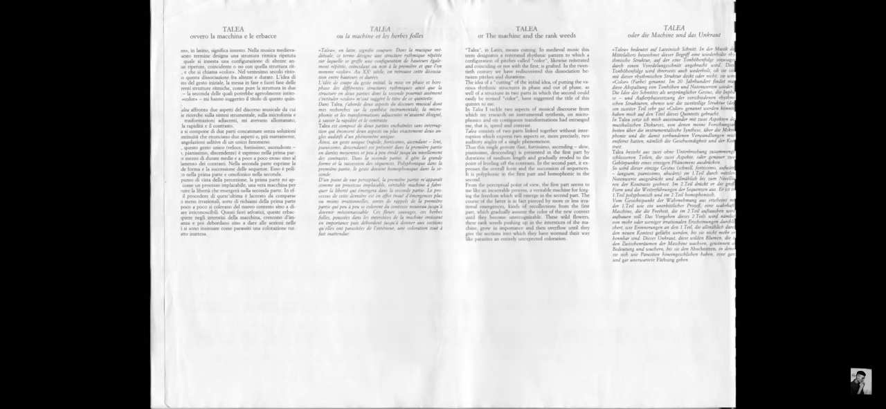 '탈레아(Talea)'라는 제목은 라틴어로 '자른다'라는 뜻이다. 이 곡은 크게 1부와 2부로 구성되어 있고, 제목에서 그러했듯 '절단'이 중요하게 다뤄진다. 쉽게 말해서 두 덩어리로 된 음악이라는 뜻이다. 이 곡이 시작할때 갑자기 음들이 빠르게 지나간다. 그리고 또 갑자기 멈춘다. 절단이다. 이어서 아주 작고 느린 부분이 등장한다.