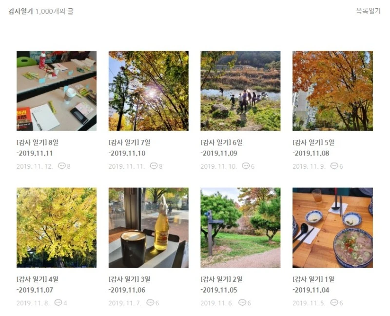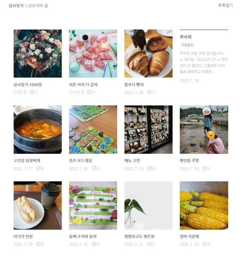 2019년 11월 4일부터 시작한 감사일기가 2022년 7월 30일, 1000일이 되었다. 이렇게 오랜 기간 계속 쓸 줄은 몰랐다. 1000일이 된 것도, 지금까지 꾸준히 써 온 나도 신기하다. 블로그에서 운영하고 있는 매일 글쓰기 '매글'에서 2주 쓰고 1주를 쉬고 있으니 그렇게 쌓인 글도 꽤 된다. 매글에서 쓴 글 중 매주 한 편을 골라 브런치에 올렸다. 그동안 썼던 글을 읽어보았는데 사진첩을 들여다보는 것처럼 기억이 새록새록 떠올라 즐거웠다.