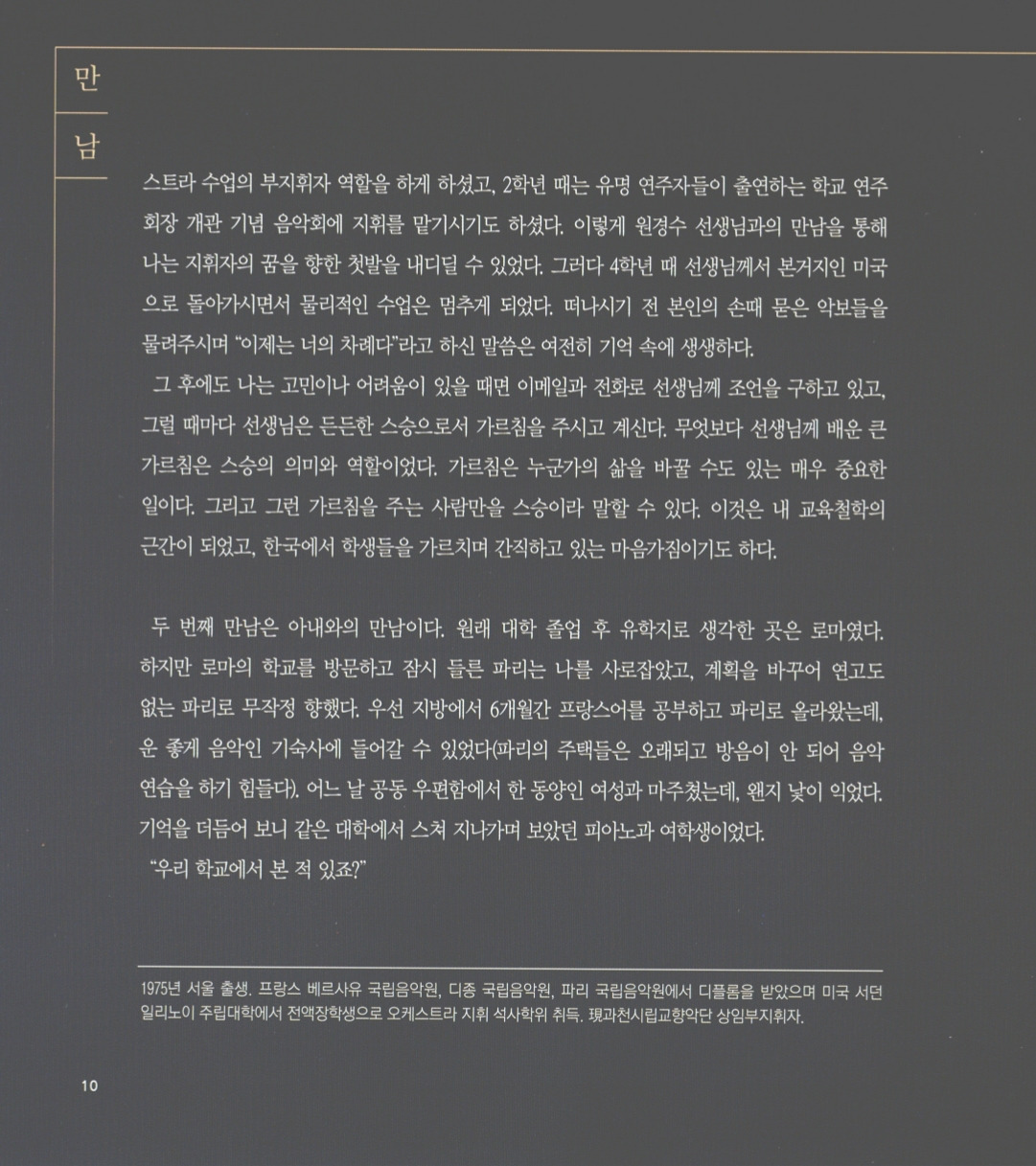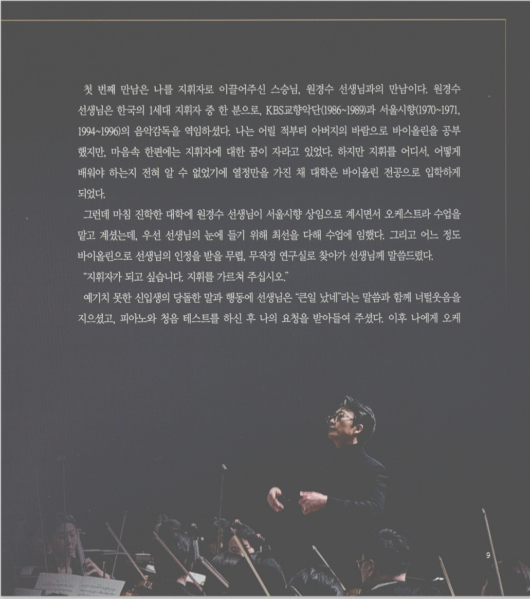 첫 번째 만남은 나를 지휘자로 이끌어주신 스승님, 원경수 선생님과의 만남이다. 원경수 선생님은 한국의 1세대 지휘자 중 한 분으로 KBS교향악단(1986~1989)과 서울시향(1970~1971, 1994~1996)의 음악감독을 역임하셨다. 나는 어릴 적부터 아버지의 바람으로 바이올린을 공부했지만, 마음속 한편에는 지휘자에 대한 꿈이 자라고 있었다. 하지만 지휘를 어디서, 어떻게 배워야 하는지 전혀 알 수 없었기에 열정만을 가진 채 대학은 바이올린 전공으로 입학하게 되었다. 마침 진학한 대학에 원경수 선생님이 서울시향 상임으로 계시면서 오케스트라 수업을 맡고 계셨는데, 우선 선생님의 눈에 들기 위해 최선을 다해 수업에 임했다. 그리고 어느 정도 바이올린으로 선생님의 인정을 받을 무렵 무작정 연구실로 찾아가 선생님께 말했다. “지휘자가 되고 싶습니다. 지휘를 가르쳐 주십시오.” 예기치 못한 신입생의 당돌한 말과 행동에 선생님은 “큰일 났네”라는 말씀과 함께 너털웃음을 지으셨고 피아노와 청음 테스트를 하신 후 나의 요청을 받아들여 주셨다.