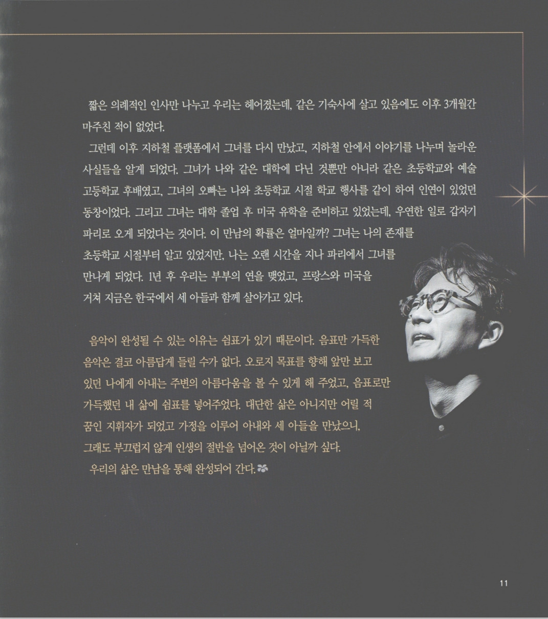 음악이 완성될 수 있는 이유는 쉼표가 있기 때문이다. 음표만 가득한 음악은 결코 아름답게 들릴 수가 없다. 오로지 목표를 향해 앞만 보고 있던 나에게 아내는 주변의 아름다움을 볼 수 있게 해 주었고 음표로만 가득했던 내 삶에 쉼표를 넣어주었다. 대단한 삶은 아니지만 어릴 적 꿈인 지휘자가 되었고 가정을 이루어 아내와 세 아들을 만났으니, 그래도 부끄럽지 않게 인생의 절반을 넘어온 것이 아닐까 싶다. 우리의 삶은 만남을 통해 완성되어 간다.