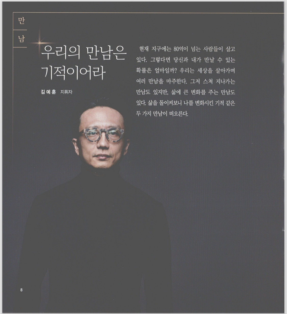 현재 지구에는 80억이 넘는 사람들이 살고 있다. 그렇다면 당신과 내가 만날 수 있는 확률은 얼마일까? 우리는 세상을 살아가며 여러 만남을 마주한다. 그저 스쳐 지나가는 만남도 있지만, 삶에 큰 변화를 주는 만남도 있다. 삶을 돌이켜보니 나를 변화시킨 기적 같은 두 가지 만남이 떠오른다.