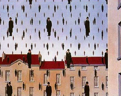 이 비를 보고 그린 것 같은 작품 겨울비. 또는 골콩드의 제목을 갖고 있는 초현실주의 화가로 유명한 르네 마그리트의 그림입니다. 사람이 비가 되어 내린다면 어떤 일이 벌어질까요?