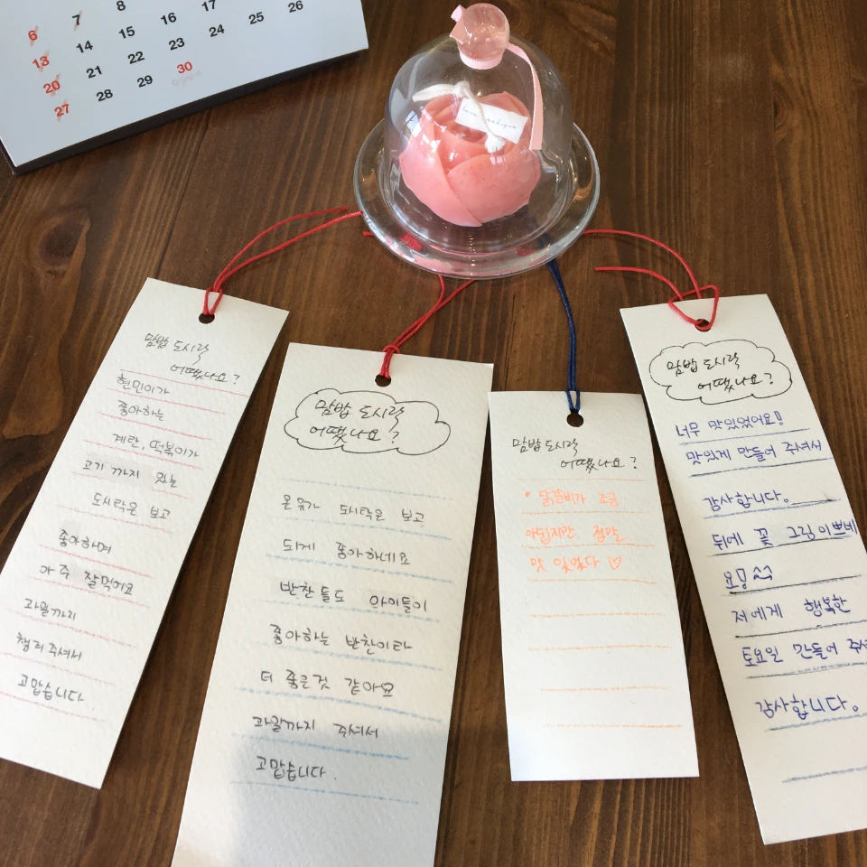 안에 후기를 적어달라고 했더니 감사하다고, 맛있는 한 끼였다고, 어떤 누나는 동생들이 다 좋아하는 반찬이어서 너무 감사했다는 말에