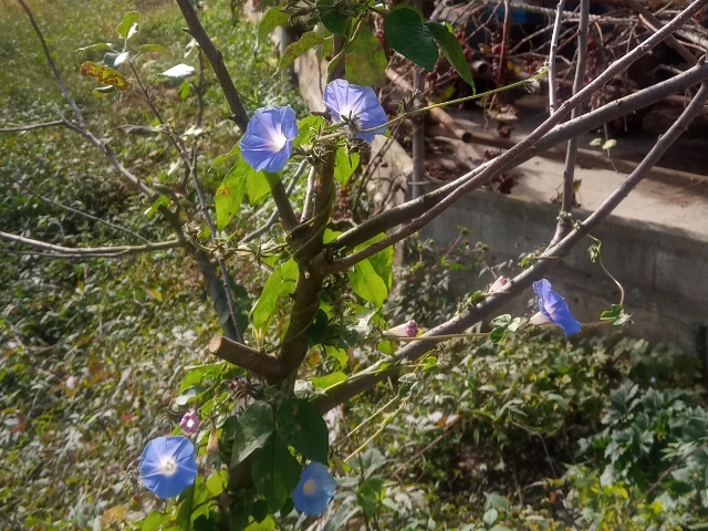 하지만 자세히 보니 보라색 나팔꽃이 제 집인양 자리를 잡았다. 가지를 감싸고 껴안고 유희를 하는 무희처럼