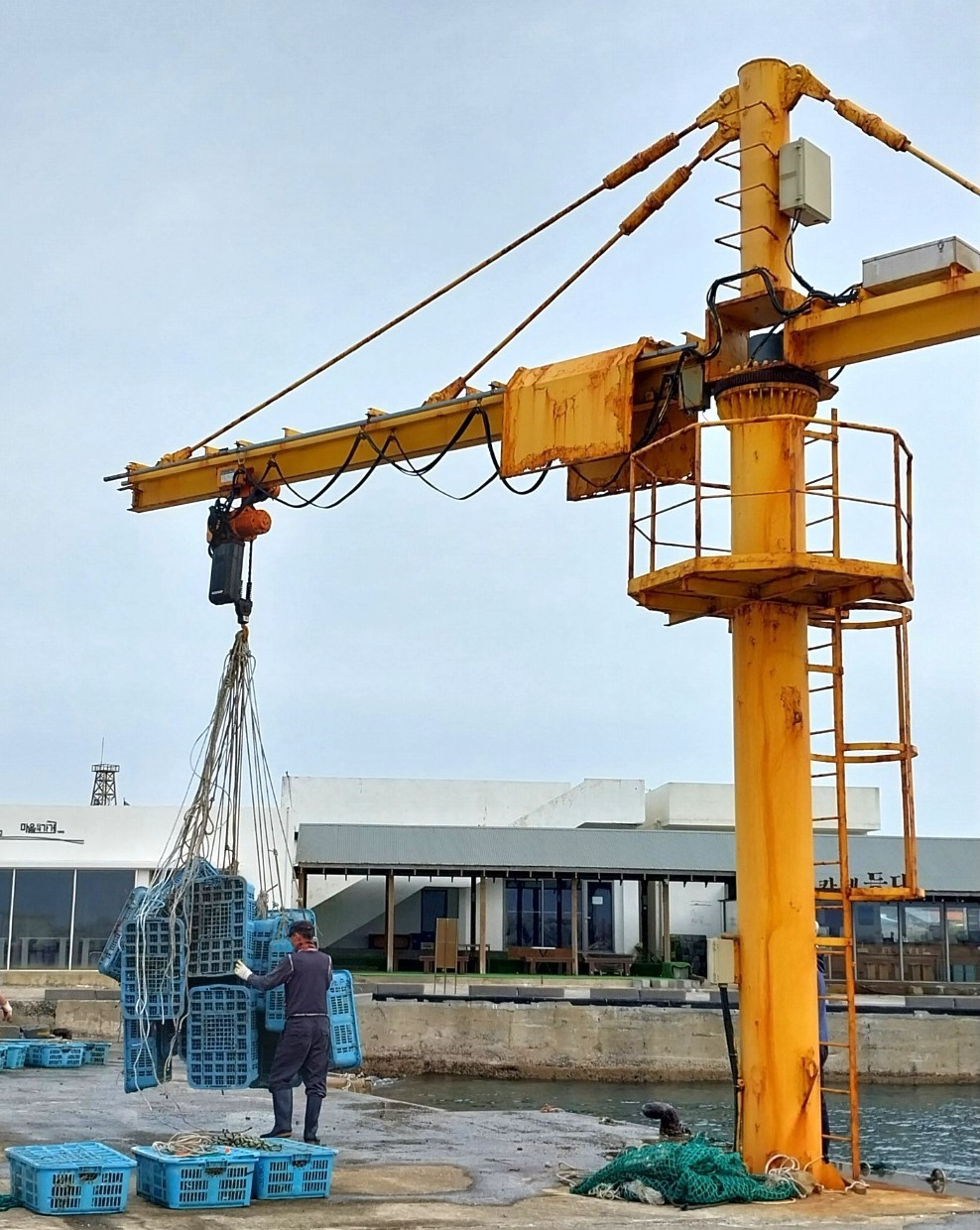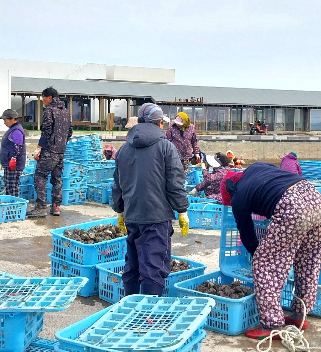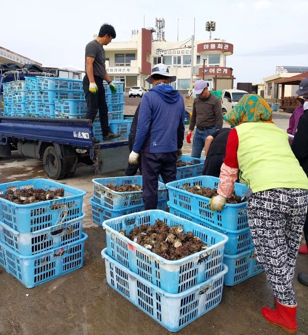 뿔소라는 채취 즉시 플라스틱 바구니에 담아 어촌계 앞 바당에 담가놓는다. 출하 전까지 싱싱함을 유지하려는 것이다. 해녀들은 일찍부터 나와 기중기로 들어 올린 바구니 속을 점검한다. 타지로 나간 아이들에게 보낼 작은 소라를 골라내면서 상한 물건은 없는지 살피는 것이다. 확인이 끝난 바구니는 트럭 쪽으로 끌고 가는데, 남편이 있는 쪽은 운반이 수월하지만, 그렇지 않은 해녀에게는 겹쳐진 바구니 무게가 만만찮다. 나라도 거들 타임이지만 삼촌들은 옷이 더러워진다며 손사래를 친다.