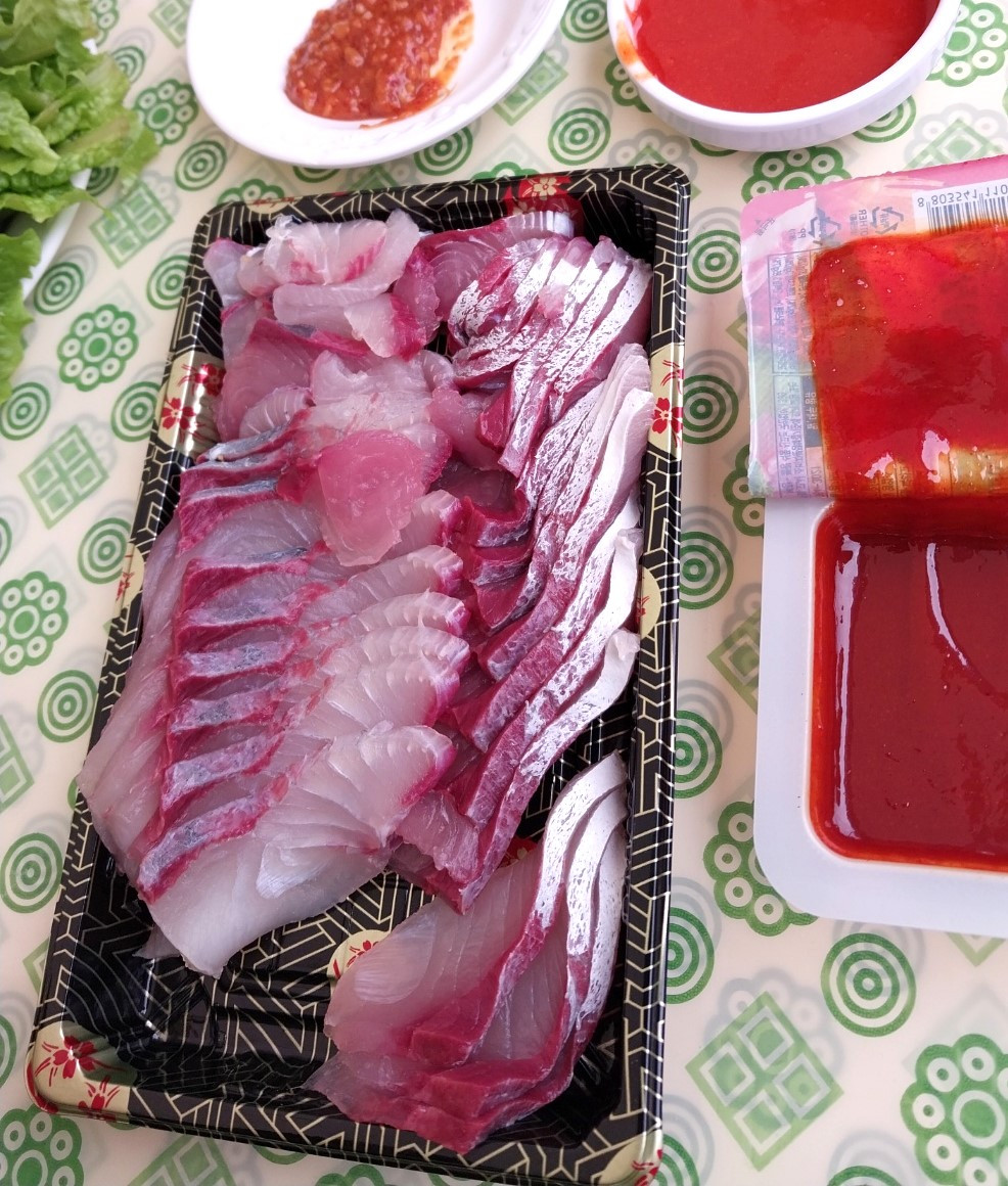 방어축제장과 방어맨손잡기 행사를 구경한 다음 황재수산에 들렀다. 특대방어들이 수조에서 유유히 노닐고 있었는데, 크기도 크기지만 배의 볼륨이 어마어마했다. 사람들이 벌떼처럼 달라붙어도 남을 듯했다. 10킬로 정도로 보이는 특대방어를 손가락으로 가리키니 30만 원이란다. 4명이 나누어 먹을 거라 했더니, 그 방어를 해체해 일부를 덜어낸 다음 회를 떠서 바로 먹을 수 있게 보내준단다. 6만 원.