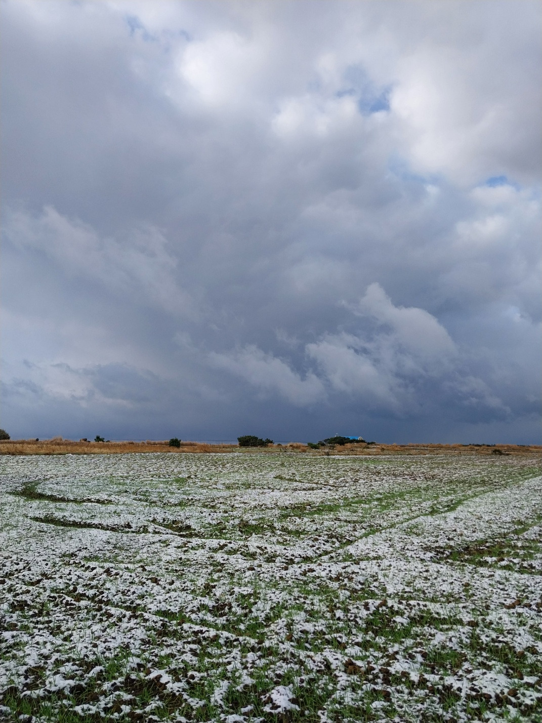 싹이 한창 돋아나는 청보리 위로 눈이 쌓였다.