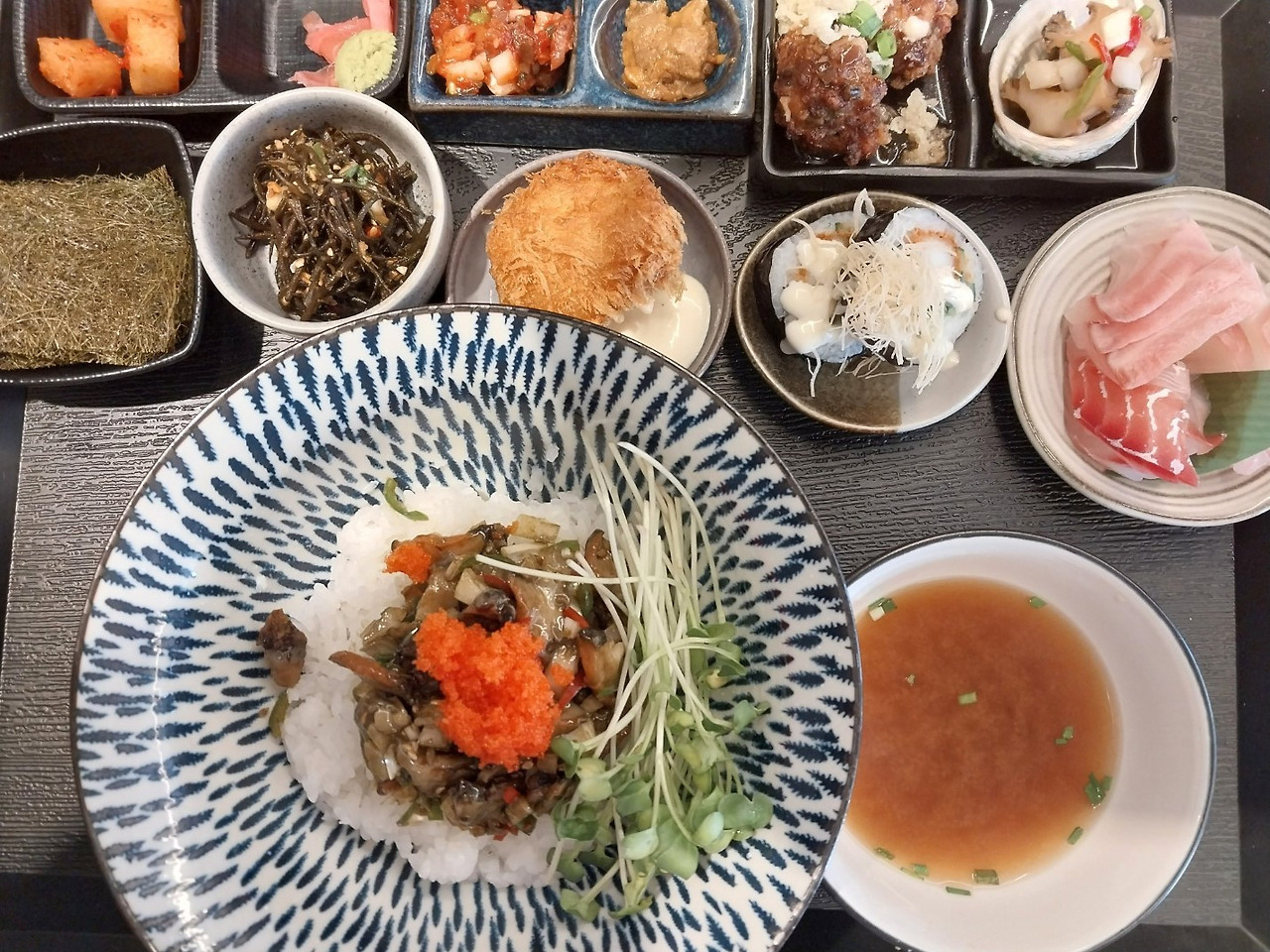 메뉴는 할아방 세트, 할망 세트, 아방 세트, 어멍 세트, 손지 세트 등이다. 내가 먹은 것은 할망 세트로, 뿔소라속젓덮밥이다. 곁들이는 찬으로 싱싱한 회, 문어튀김, 전복장, 톳무침, 구운 감태 등이 배부르지 않을 만큼 알맞게 나온다. 또똣한 된장국 한 숟갈은 입안의 찬기를 다독인다.