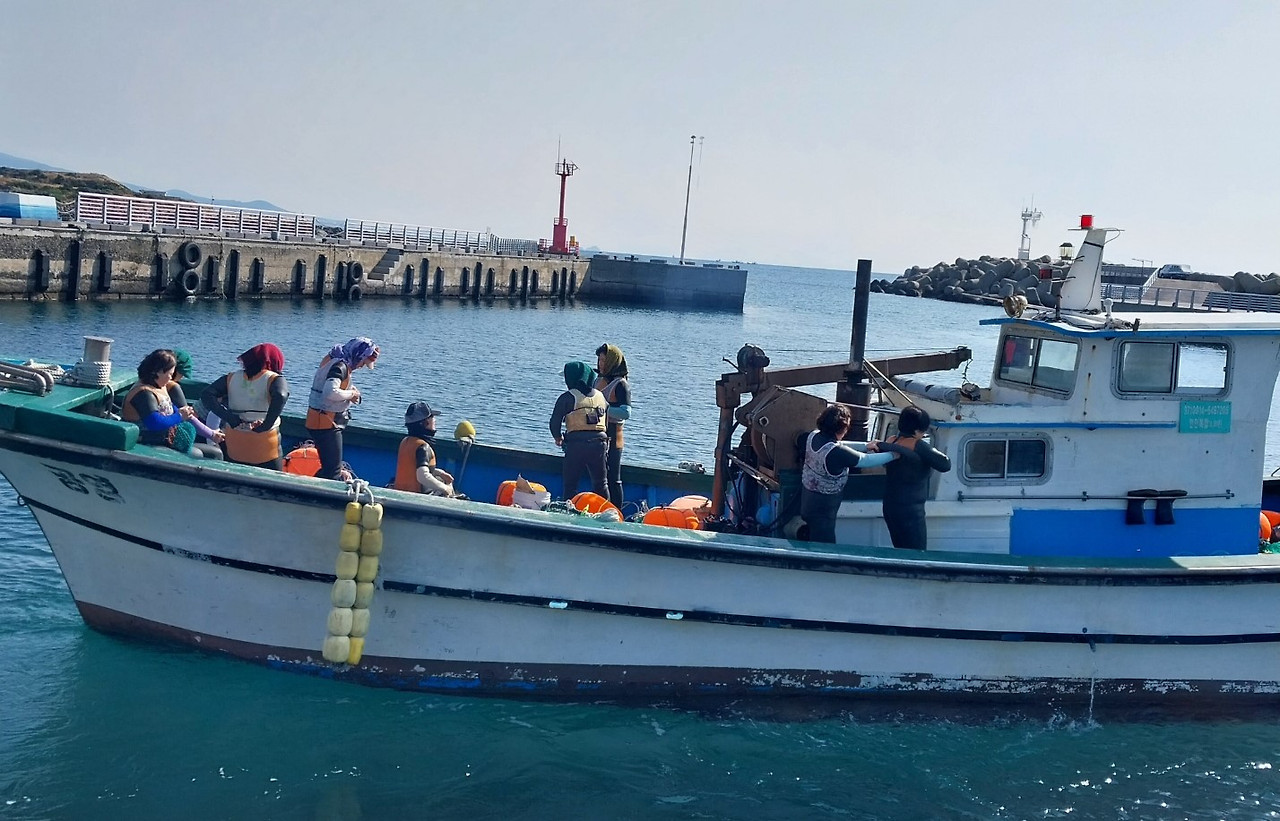조류, 여기 식으로 말하자면 ‘물 쪼리’가 맞고 파도가 잔잔한 오늘은 해녀들이 물질을 하는 날이다. 테왁과 망사리 점검을 끝낸 ‘뱃물질 여전사’ 열셋은 배 위에서 수다로 왁자하다. 그들은 파이팅을 전하러 나온 어촌계장의 인사를 받고는 손을 흔들며 하동 항구에서 멀어진다. 수평선 저 멀리까지 나아가 오늘도 전복, 홍해삼, 뿔소라를 담뿍 잡아 올릴 태세다. 그들은 이어도 사나, 이어도 사나, 뱃노래를 흥얼거리며 단전에 힘을 모을 것이다.