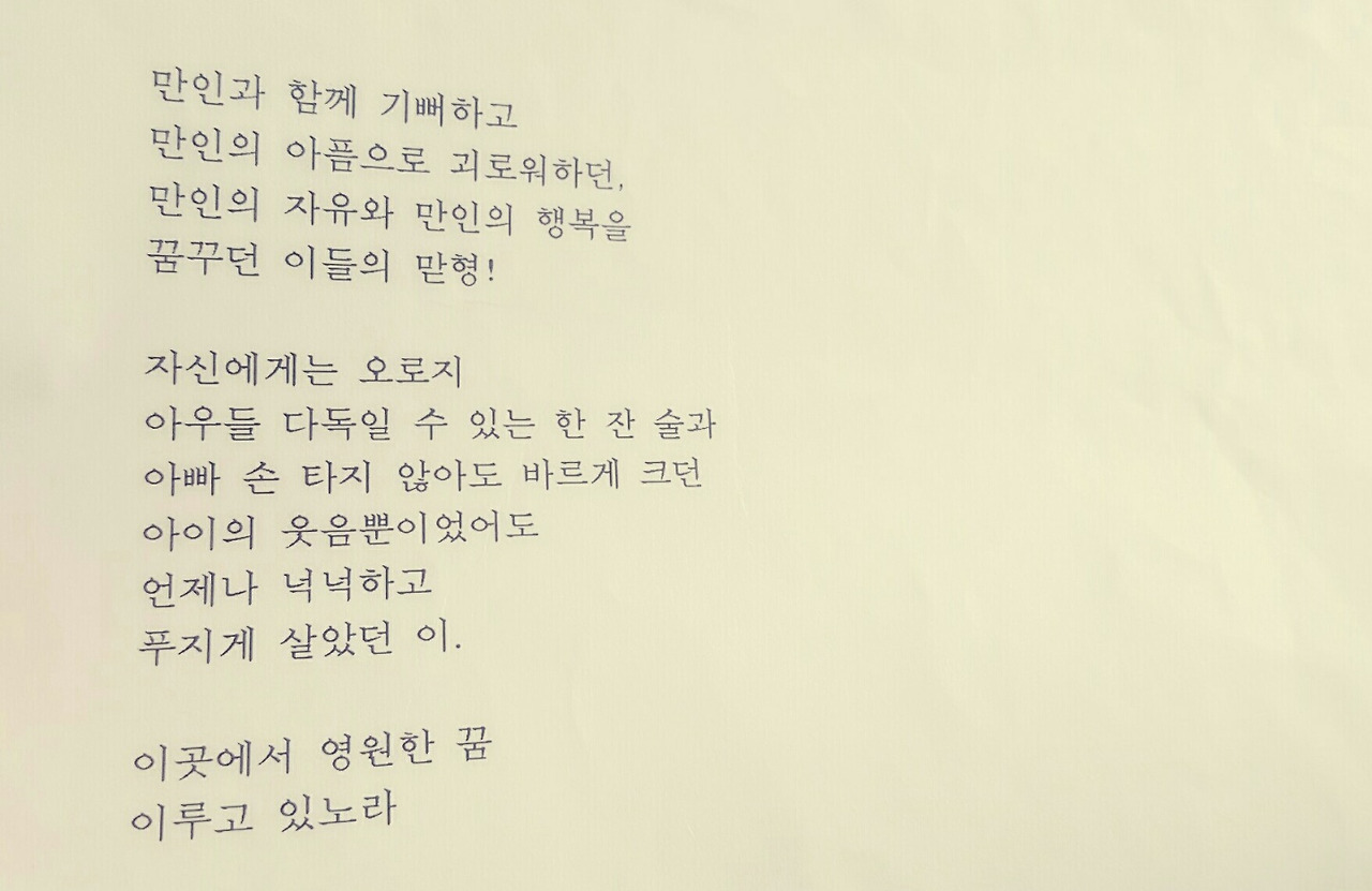 당장에 달려가 외로이 새우잠을 잤을 그 남자를 안아줄 수 있으면 좋으련만, 이 바람은 평생 소망으로만 남아 있겠지요. 아끼는 아우의 아픔 앞에 한 가슴 다 내어 울어줄 수 있었던 푸근한 사람을, 그래서 후배들이 잊지 못하고 기념비에 따뜻한 시를 담아 찾아와 주었던 사람을, 내 멋대로 '나약한' 사람이라 여겼던 것이 미어지는 새벽녘입니다. 제게는 저를 딸이라 부르는 은사님이 한 분 계시는데요. 아들의 작은 상장을 프로필 사진으로 해놓고 그 얘기를 하며 가슴 깊은 곳에서 올라오는 기쁨을 내비친 적이 있습니다. 진주 어느 병실, 비슷한 표정을 보이며 눈이 맑은 그도 활짝 웃었겠지요. 그때 글쓰기 상을 받은 것은 첫째였지만, 글을 놓지 않겠다는 약속은 둘째가 건넵니다. 어쩌면 아버지를 닮아 글을 이토록 사랑하는 그 아가씨는 미루고 미루다 오늘에서야 귀중한 역사를 정립하며 한바탕 울었을지도 모릅니다.