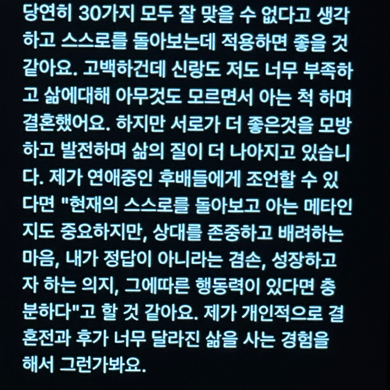 오전에는 독서모임에서 생각을 나누고, 오후에는 오랜 동기의 청첩장을 받았다. 삶의 방향에 대해 고민하며 노력하는 이들에게서 받는 인사이트는 동기부여가 되었고, 저녁의 만남에서는 가까운 사람들이 평안히 살아가는 모습에서 안도감을 받았다. 30대의 화두는 결혼이 되었는데 이미 한 사람들에게는 결혼생활, 아직인 사람들에게는 반려자를 만나는 일이었다. 관련 영상을 받고서 댓글을 보는데 인상 깊었다. ‘상대를 존중하고 배려하는 마음, 내가 정답이 아니라는 겸손, 성장하고자 하는 의지, 그에 따른 행동력‘은 스스로에게 묻고 싶은 것이기도 했다.