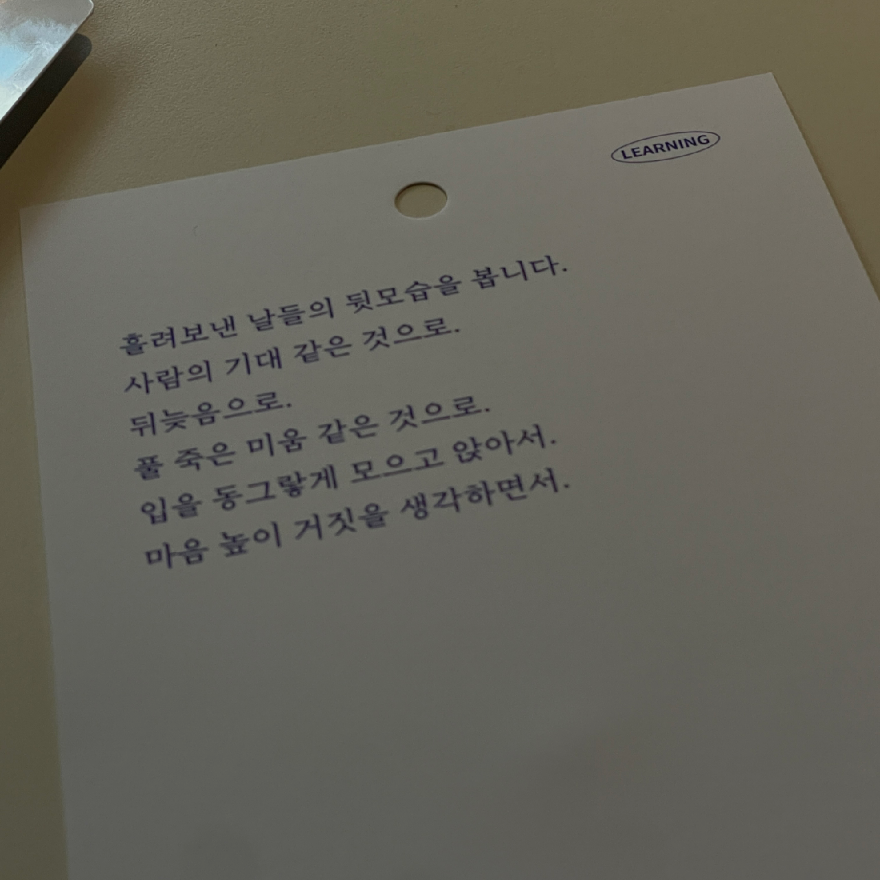 소정이가 서울에 왔다. 오랜만에 대화를 나누는 점심시간이었다. 꾸미지 않고, 솔직하고 유쾌하게 소통할 수 있는 오랜 친구다. 그런 대면과 대화가 에너지를 주었다. 전시를 보러 갔다가 내가 떠오르던 글귀가 있어 하나 집어왔다고 했다. 가만한 문장들을 보니 좋았다. 어제 달리기를 했던 덕분인지, 며칠 동안 풀리지 않던 업무를 해냈고, 가야 했던 병원도 갔다. 할 일을 하나씩 해나가는 사이 소중한 사람들과 소통하는 것, 그 정도면 꽤 괜찮은 날이 되어 있었다.