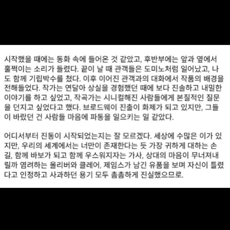 알고리즘에 유퀴즈가 나왔다. 그리고 <어쩌면 해피엔딩>의 박천휴 작가님이 화면에 보였다. 너무도 당연히, 빠짐없이 보았다. 이 작품을 쓰게 된 계기를 물었다. 그는 답했다. "제가 그때 당시 개인적으로는 좀 힘든 시기였거든요. 오랫동안 교제하던 연인과 헤어지고, 가장 친한 친구 중에 한 명이, 저랑 한 살 차이밖에 안 나는데, 암 선고를 받더니 8개월 만에 네...그래서 안 친했다면 이렇게 안 힘들텐데, 왜 항상 사람들이랑 이렇게 친할까? 왜 친하고 싶은 걸까, 이런 생각을 많이 하던 시기였어요. 차라리 혼자면 좋을텐데"라 이야기를 시작했다. 카페에서 Everyday Robots을 들었고, '인간이 잊고 있는 가치를 로봇이 깨닫게 되는 스토리를 써보자.'하고 윌에게 바로 문자를 보내 그날 밤에 바로 구상을 시작했다고. 운이 좋게 작년 공연에서 윌과 휴의 이야기를 현장에서 들을 수 있었다. 툭, 진솔하게 내뱉는 말들, 투명한 진심들이 마음을 건드렸다. 이후에도 '우린 왜 사랑했을까'를 종종 들었다. 들을 때마다 좋았다. 그 본질적인 질문들이 다른 언어와 문화 속 사람들의 마음도 건드렸다는 게 신기하기도 하고, 또 그만큼 본연의 것이구나 싶기도 했다. 실컷 애정할 수 있는 게 있어서, 또 그게 잘 되어서 더 쉽게 많은 히스토리를 접할 수 있어 좋다. 감사하다.