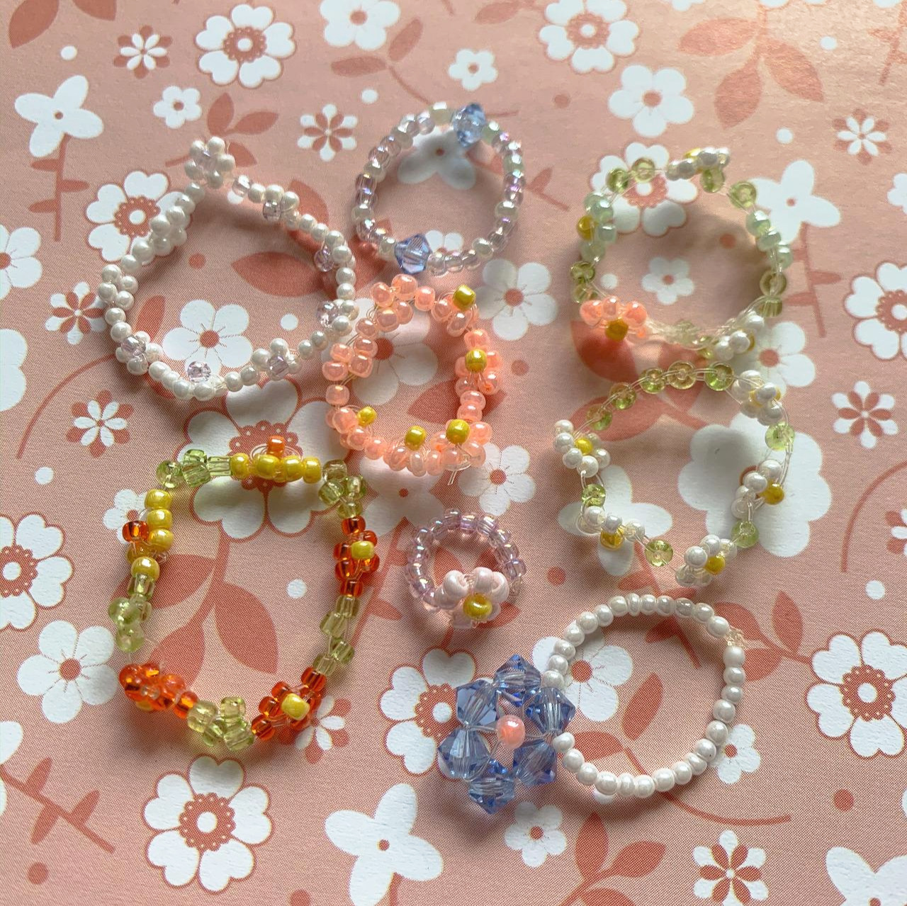비즈 반지는 여러 가지 디자인이 있는데, 2mm 작은 비즈에 낚싯줄 혹은 우레탄 줄을 끼고 디자인을 만든다. 비즈를 일렬로 꽂고 색깔과 스톤만 배치해 만들기도 하고, 낚싯줄을 여러 번 꼬아 꽃 모양을 만들기도 한다.