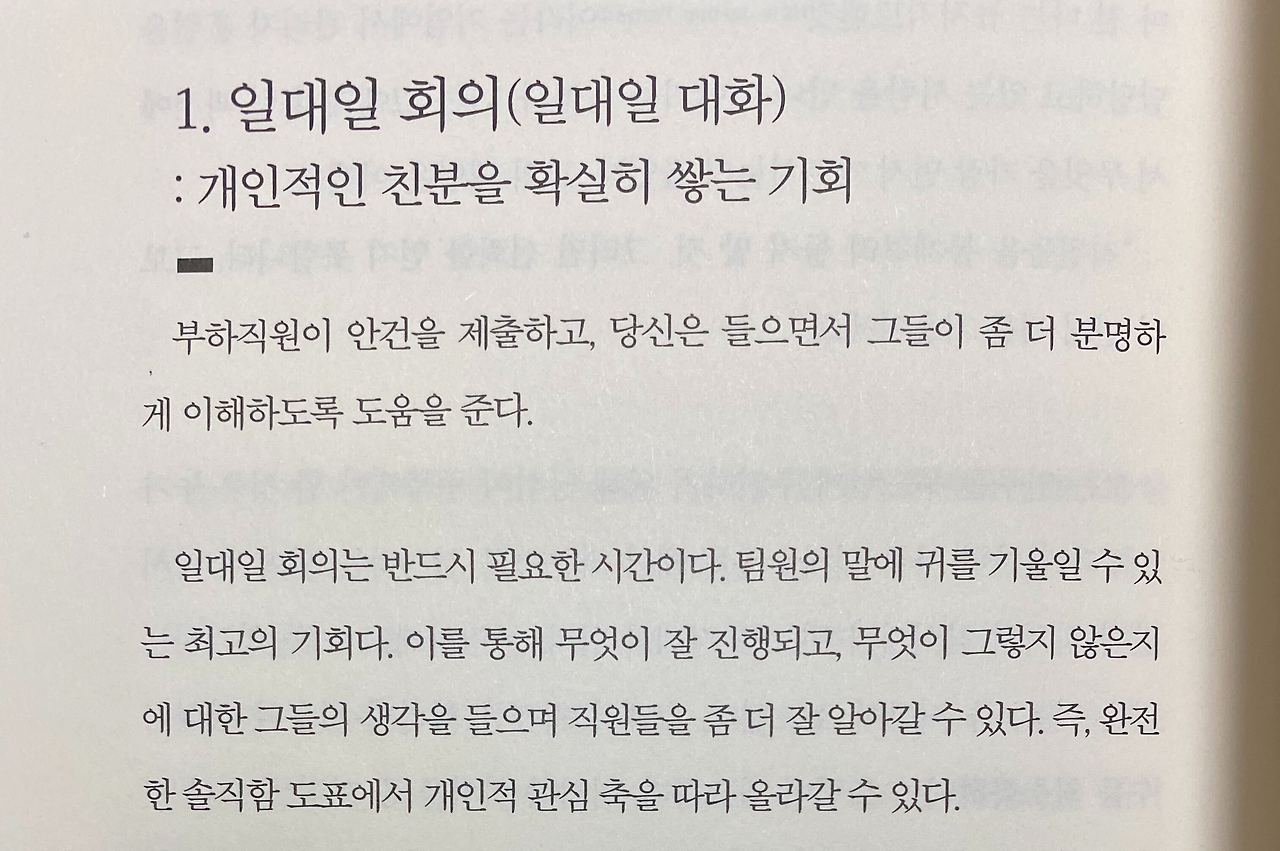 내가 읽었던 유명한 경영서들에서도 1:1 미팅 이야기가 꼭 빠지지 않고 나온다. 특히 가장 인상 깊었던 책 중 <실리콘밸리의 팀장들(원제: Radical Candor)>과 <하이 아웃풋 매니지먼트(원제: High Output Management)>에서도 1:1 미팅의 중요성이 엄청 강조되었다.