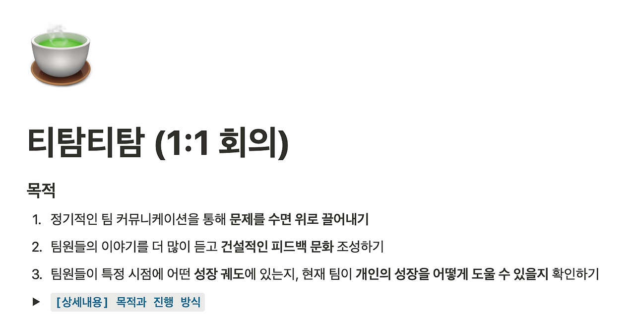 이를 통해 티탐티탐의 목적 세 가지 중 3) 개인 성장/개인적 관심에 조금 더 힘을 실을 수 있을 것이라고 생각했다. 팀원들은 내 제안을 흔쾌히 받아들여줬고, 각 세부 팀의 매니저들은 팀원들을 대상으로 월 1회 이상 티타임을 진행했다. 나는 그것과 별도로 전체 팀원을 대상으로 한 티탐티탐을 이어갔다. 그리고 모든 티탐티탐 내용은 티탐티탐 노션 페이지에 기록하기로 했다! 누구나 그 기록을 보고 서로의 상태를 파악하고 고민을 나눌 수 있다.