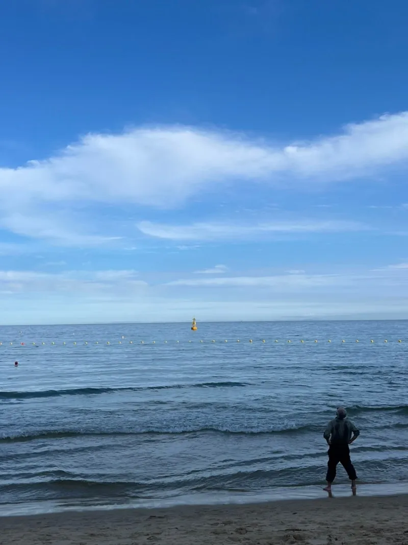돗자리 앞에 한 할아버지께서 소매와 바짓자락을 걷어올린 채 발을 담그고 계셨다. 수평선을 바라보고 기지개를 시원하게 켜고서는 지그시 하늘을 바라보셨다. 대자연을 마주함에 있어 경건한 어르신의 뒷모습을 카메라에 담지 않고선 배길 수 없었다. 나는 한참 동안이나 그 뒷모습을 바라보았다.