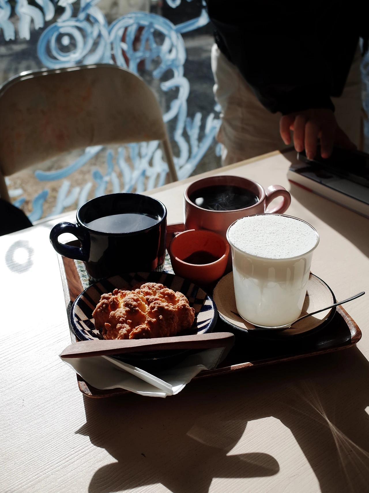 가장 좋아하는 카페는 테일입니다. 테일은 맹그로브 고성에서도 차로 15분 정도, 꽤 올라가야 하는 곳에 위치하고 있습니다. 테일은 옛날엔 가정집으로 썼을 것 같은 구조의 아담한 곳을 사장님들의 취향을 담아 아늑하게 꾸민 공간이고 커피와 디저트를 팝니다. 옛날 집이라 층고가 낮아 고개를 꽤나 숙여야 하고, 자리도 그렇게 많지 않아 불편할 법도 한데 항상 지역 주민들과 소문을 듣고 온 손님들이 가득합니다. 강아지를 좋아하신다고요? 이곳에선 가끔 돌아다니는 테일이도 만날 수 있습니다. 테일이는 제가 볼 때마다 문 앞에서 누군가 문을 열어주길 기다리고 있습니다. 문을 열어 주면 쏜살같이 튀어 나가 마당을 산책해요. 테일은 커피를 직접 로스팅하는 곳입니다. 앉아 있다 보면 커피를 로스팅하는 소리가 규칙적으로 들리면서 고소한 원두향이 여기저기 퍼집니다. 직접 로스팅한 원두로 내려주신 브루잉 커피는 핫, 아이스 구분 없이 모두 정말 맛있어요. 쟁반을 담으면 커피가 담긴 컵과 그릇이 눈에 쏙 들어옵니다. 그도 그럴 것이 사장님이 테일 포터리라는 곳을 운영하고 계셔서 감각이 남달라요. 이 집에선 아무리 식사를 많이 먹었어도 타르트를 꼭 먹어야 해요. 옥수수 타르트가 맛있는데 가끔 감자타르트도 나온다고 해요. 테일에사는 손님들이 요청하면 바닷가에 나가서 먹을 수 있도록 돗자리와 접이식 상 등이 포함된 피크닉 세트를 준비해 주세요. 저도 아직 이용해 보지는 못했는데 여름이 되면 꼭 바다로 나가서 커피와 타르트를 먹고 싶습니다. 고성에서 카페 한 곳만 갈 수 있다면 저는 테일을 갈 거예요. 함께 간 사람들과 도란도란 이야기를 나누기에도 너무 따뜻하고 좋은 공간입니다.
