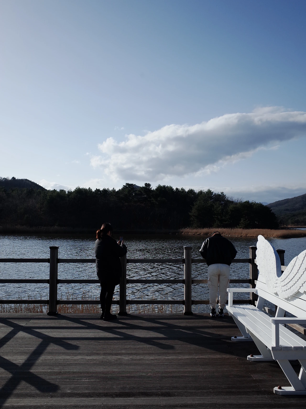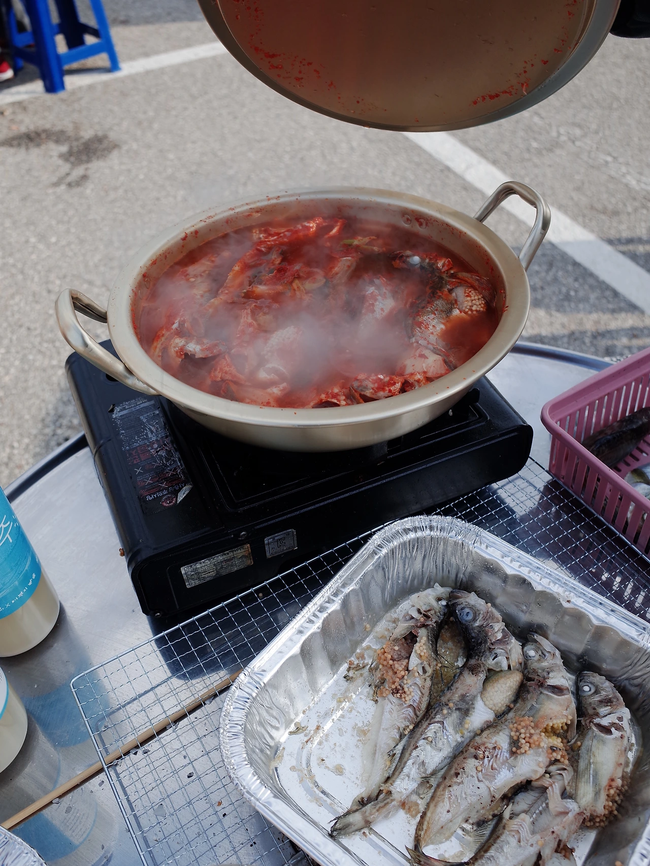 너무 늦지 않게 도루묵 축제 현장으로 향했다. 오호항은 한 번도 가본 적이 없었다. 가는 길에는 송지호 호수에 잠깐 들러서 혼자 있을 땐 절대 찍을 수 없는 날개 포토존에 앉아 기념사진을 남겼다. 오호항은 도착했을 때 이미 만차였다. 간신히 주차를 하고 나서 들어가 보니 꽤나 본격적인 현장이 펼쳐지고 있었다. 초대가수분의 열정적인 맨발 무대 앞으로 온갖 먹거리가 펼쳐져 있었다. 도루묵과 양미리, 새우를 묶어 내어 주시는 세트가 30,000원이었다. 불과 자리도 포함된 가격이었으니 나쁘지 않았다. 무엇보다 직접 구워 먹어야 한다는 게 내 흥미를 자극했다. 우리는 신이 나서 금게라면과 오징어순대까지 시켜서 한상을 차렸다. 바람이 많이 불어서 그릇과 젓가락이 수시로 날아갔다.
