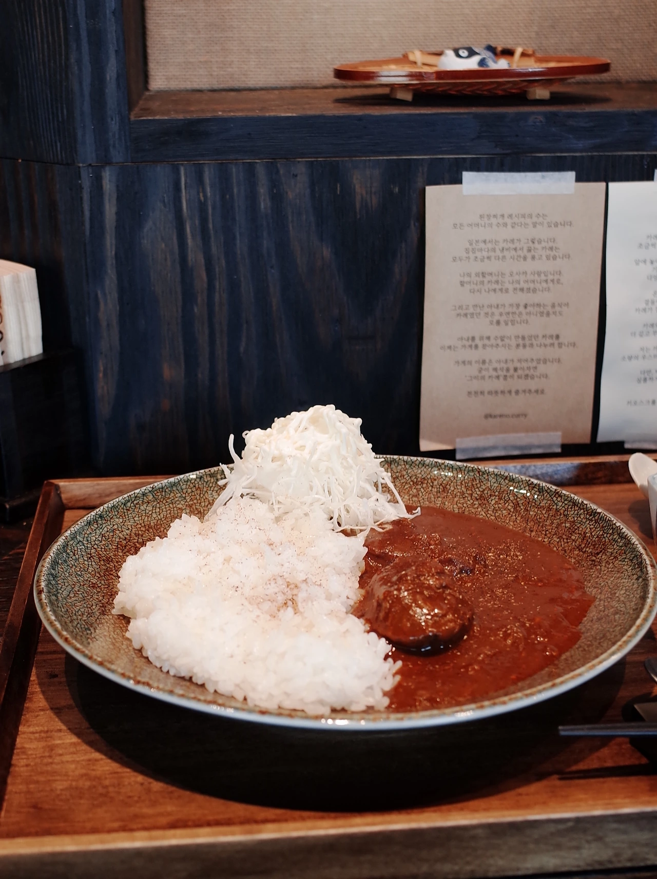 세리님과 지아 님은 카레를 무척 좋아하셨다. 카레에 대한 큰 애정은 없지만 카레노카레를 오픈런하기로 했다. 20분 전에 갔는데 이미 한 커플이 기다리고 있었다. 11시에 문이 열리자마자 착석해서 순서대로 음식을 받았다. 카레노카레와 버터치킨카레, 감자사라다, 반숙란과 음료가 다였기에 별로 고민할 것이 없었는데도 한참을 고민했다. 우리는 모두 카레노카레를 먹었고 감자사라다를 하나 시켜 나눠먹었는데, 카레도 맛있었지만 감자사라다에 눈이 번쩍 뜨였다. 이자카야를 가면 사라다를 시켜 먹는 걸 좋아한다. 여기 감자사라다엔 들기름과 핑크페퍼가 들어가서 그런지 맛의 임팩트가 있었다. 공간은 말할 것도 없이 좋았도, 접객하는 태도도 무척 좋았다. 사장님이 도루묵축제가 열리는 것을 아냐고 해서, 마침 그 축제에 가려고 한다니 반가워하셨다.