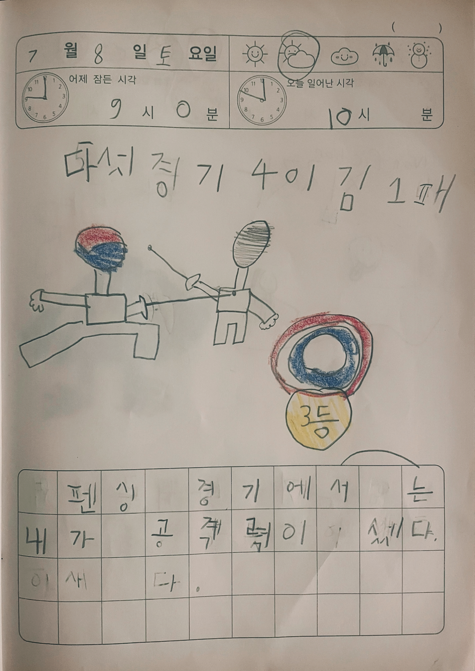 “호제야, 제천 경기에서 호제 정말 잘 해냈어. 칼이 무거웠을 텐데 끝까지 잘 버텼어. 몸도 피곤했을 텐데 레슨도 한 번 더 늘려서 가고. 열심히 연습해서 끝까지 해낸 호제 스스로를 많이 축하해 줘. 스스로 꼭 안아주며 토닥토닥해 주자. “