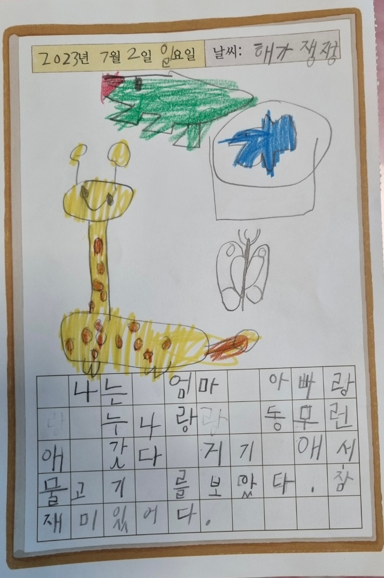 ”호제야, 해가 더 뜨겁게 비출 때는 ‘ㅈ’을 하나씩 더 적어서 “쨍쨍”이라 적어주자. 표현 너무 좋다! 어떻게 생각한 거야?! “
