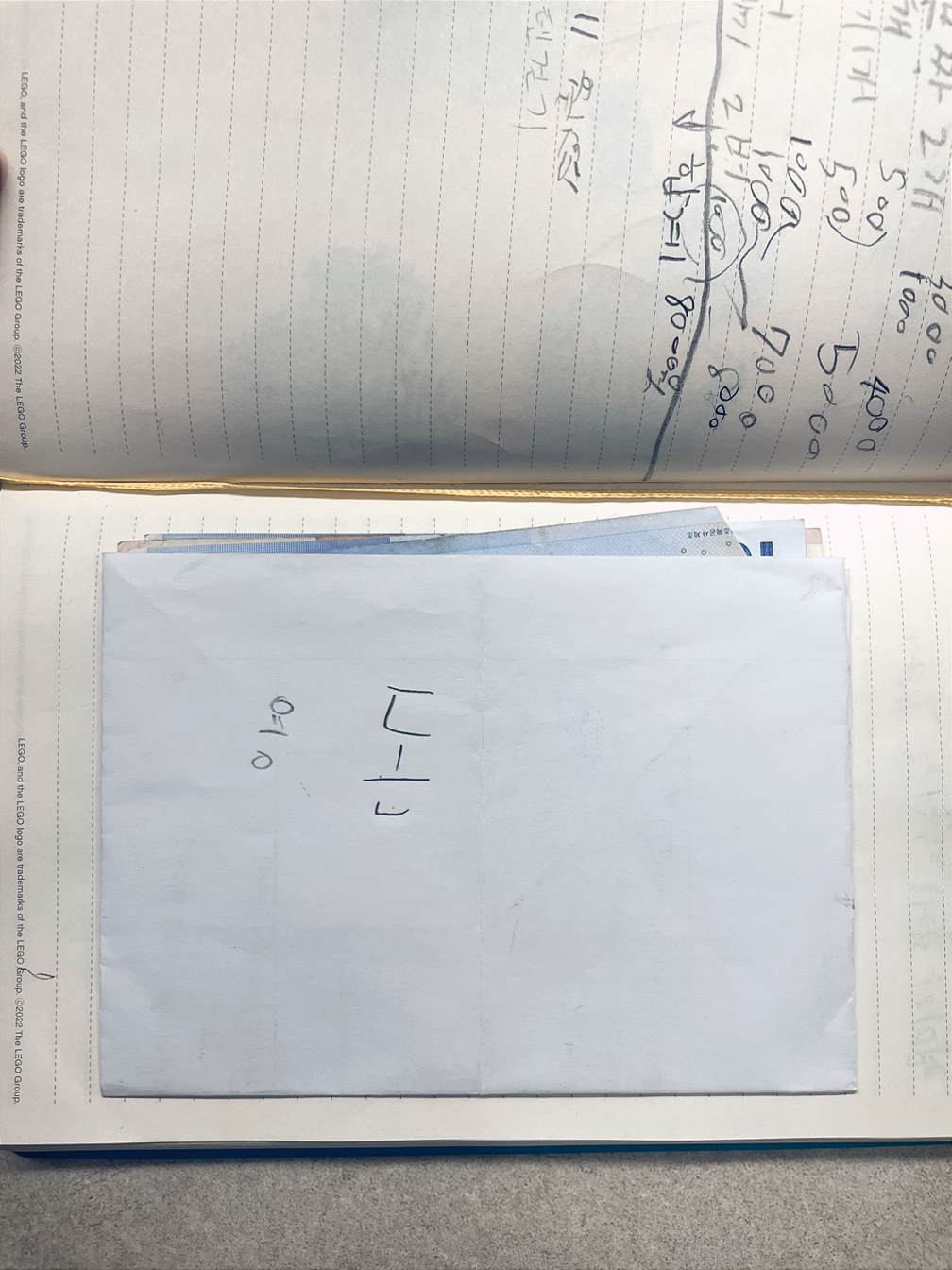 용돈 주머니는 호제가 이면지를 접어 만들어 레고 다이어리에 붙여놓은 것이다. 옆면에는 자기가 한 일과 금액이 적혀있다. 일종의 장부, 통장인 셈이다.