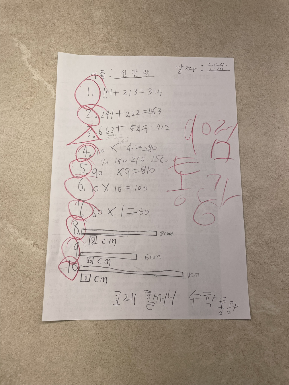 종종 열렸던 수학 시간. 호제가 퀴즈를 내고, 할머니가 문제를 풀어야 했다. 눈치껏 할머니는 한두 문제는 틀리게 적었다. 호제가 틀린 걸 알아챌 수 있는 틀린 답을 적었다. 호제 스스로도 못 푸는 문제를 낼 때는 셀프 채점도 해야 했다.