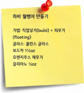 하비 월뱅어(Harvey wallbanger)는 캘리포니아의 서퍼(surfer, 서핑 선수)인 하비(Harvey)씨가 경기에서 지고 안 좋은 마음을 달래기 위해 마신 칵테일입니다. 하비가 칵테일을 마시고 취해서 벽에 부딪히며 돌아가는 모습을 보고 사람들이 ‘벽에 부딪히는 하비’라고 불렀던 것이 칵테일의 이름으로 이어졌습니다.
