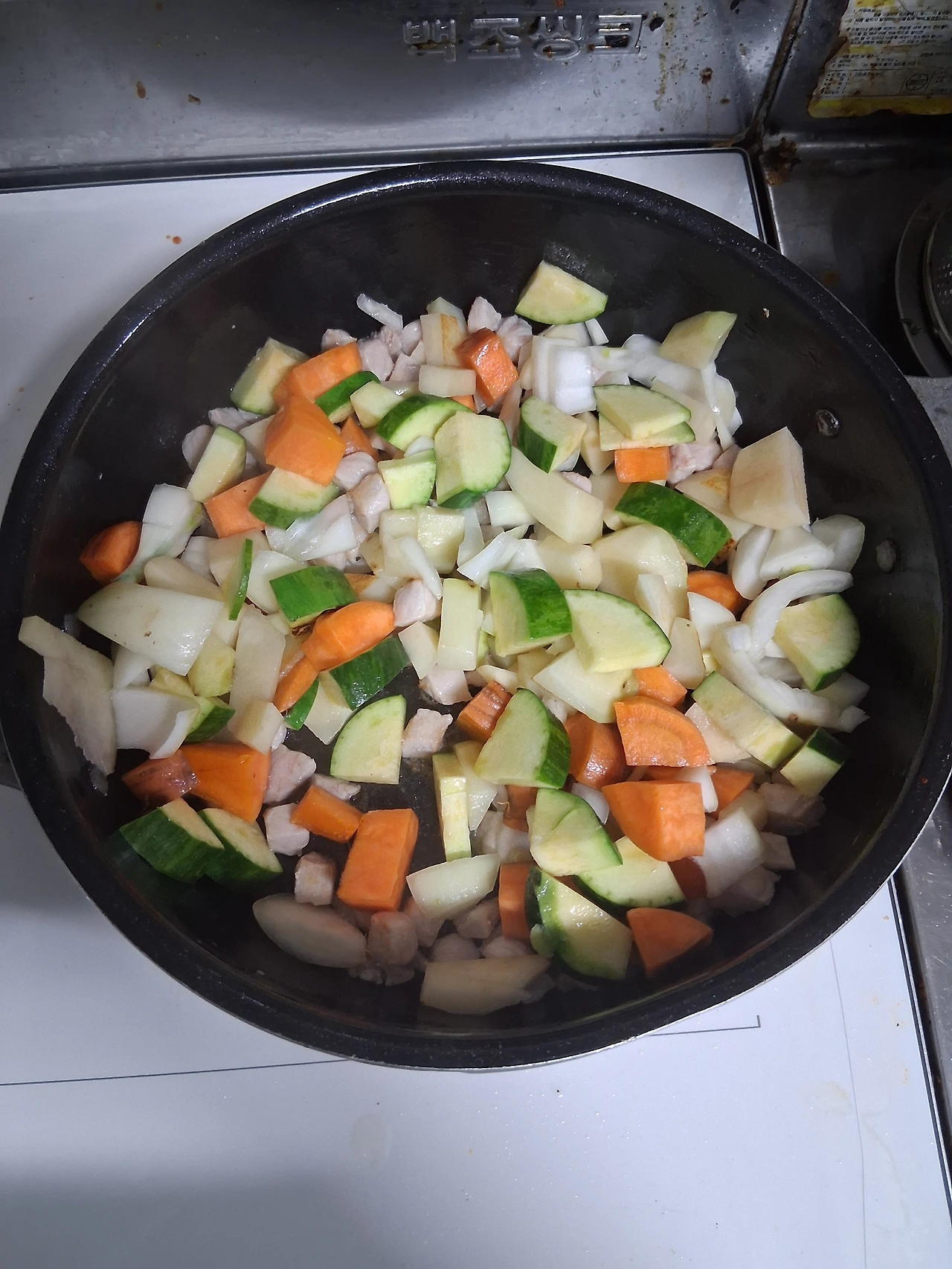 당근(꼭 씻어서 손질하세요 당근은 흙이 엄청 만많아서 씻어서 손질해야 해요) , 그다음은 애호박 (한번 물에 슬기 흘려주세요)