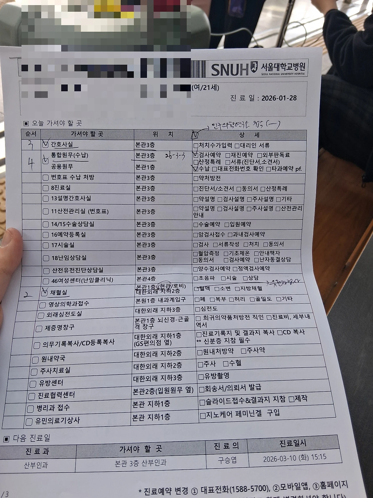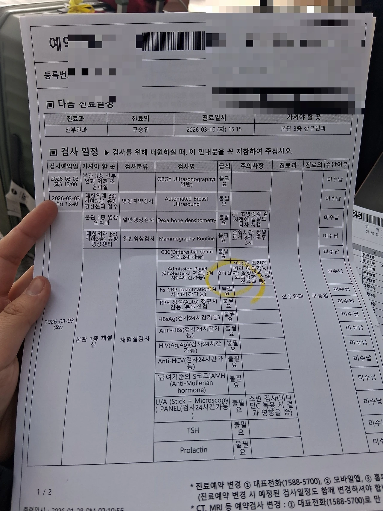 나는 진료를 보고 (염색체검사 유전자건사 당일 처방을 받고) 다음에와서 호로몬 검사 피검사 자궁초음파 골밀도검사 유방초음파 피검사 등을 하기로했다 진료보고 설명간호사실에가서 유전자검사 동의서에 싸인했다