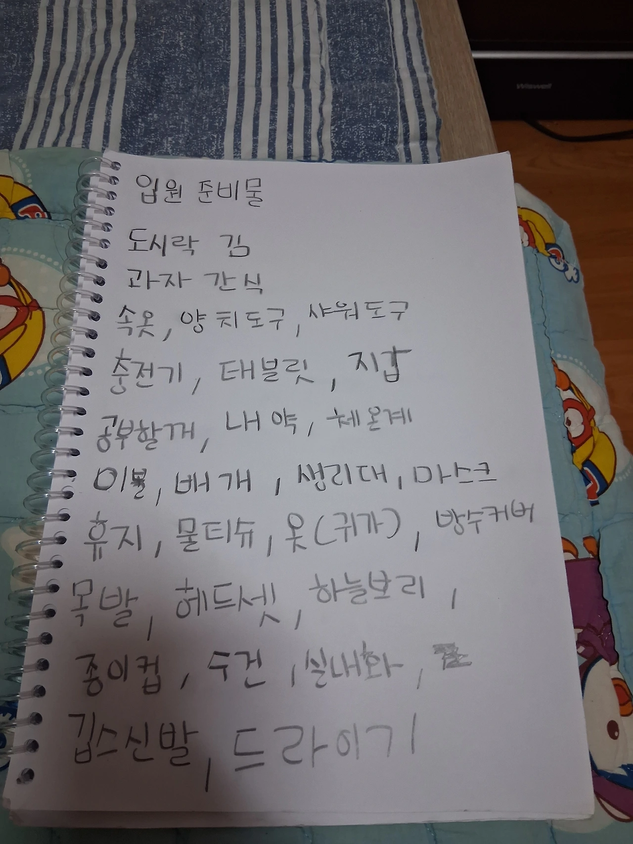저건 간단하게 챙길 준비물이고 저거 외 몇가지는 입원후에 사는걸로 했다 (내가 먹을 물과 간식 방수커버)