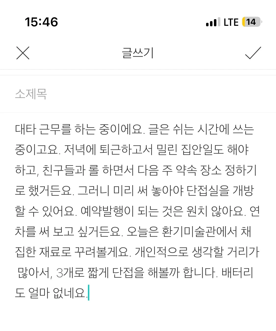 대타 근무를 하는 중이에요. 쉬는 시간에 쓰는 중이고요. 저녁에 퇴근하고서 밀린 집안일도 해야 하고, 친구들과 롤 하면서 다음 주 약속 장소 정하기로 했거든요. 그러니 미리 써 놓아야 단접실을 개방할 수 있어요. 예약발행이 되는 것은 원치 않아요. 연차를 써 보고 싶거든요. 오늘은 환기미술관에서 채집한 재료로 꾸려볼게요. 개인적으로 생각할 거리가 많아서, 3개로 짧게 단접을 해볼까 합니다. 배터리도 얼마 없네요.