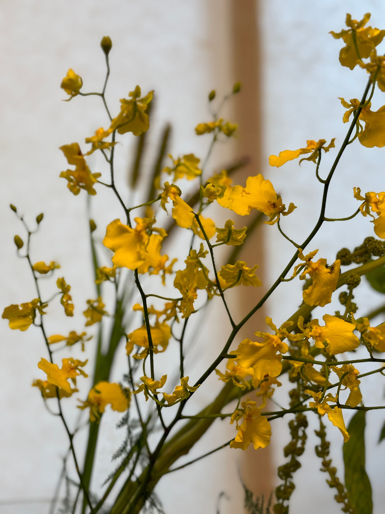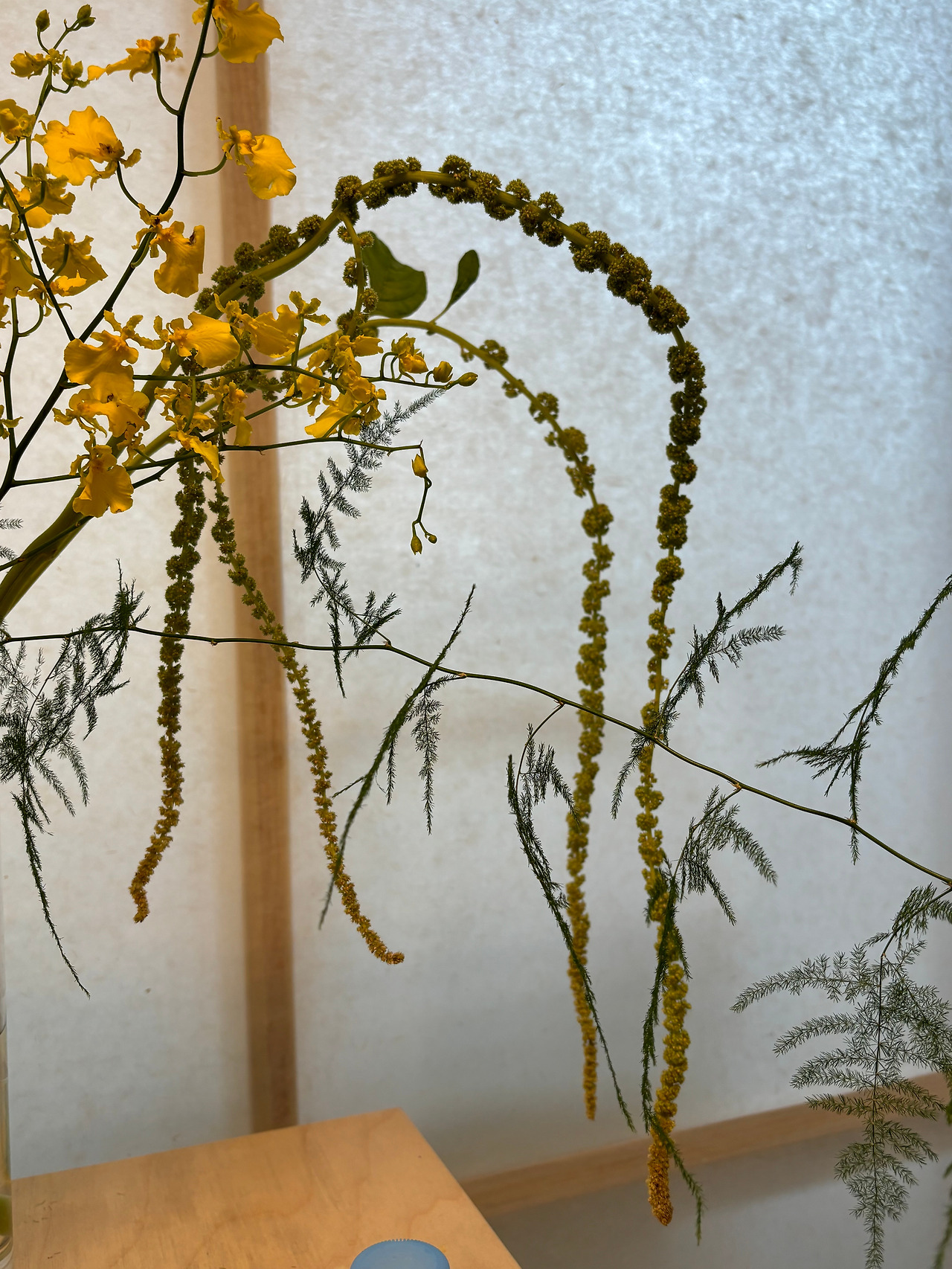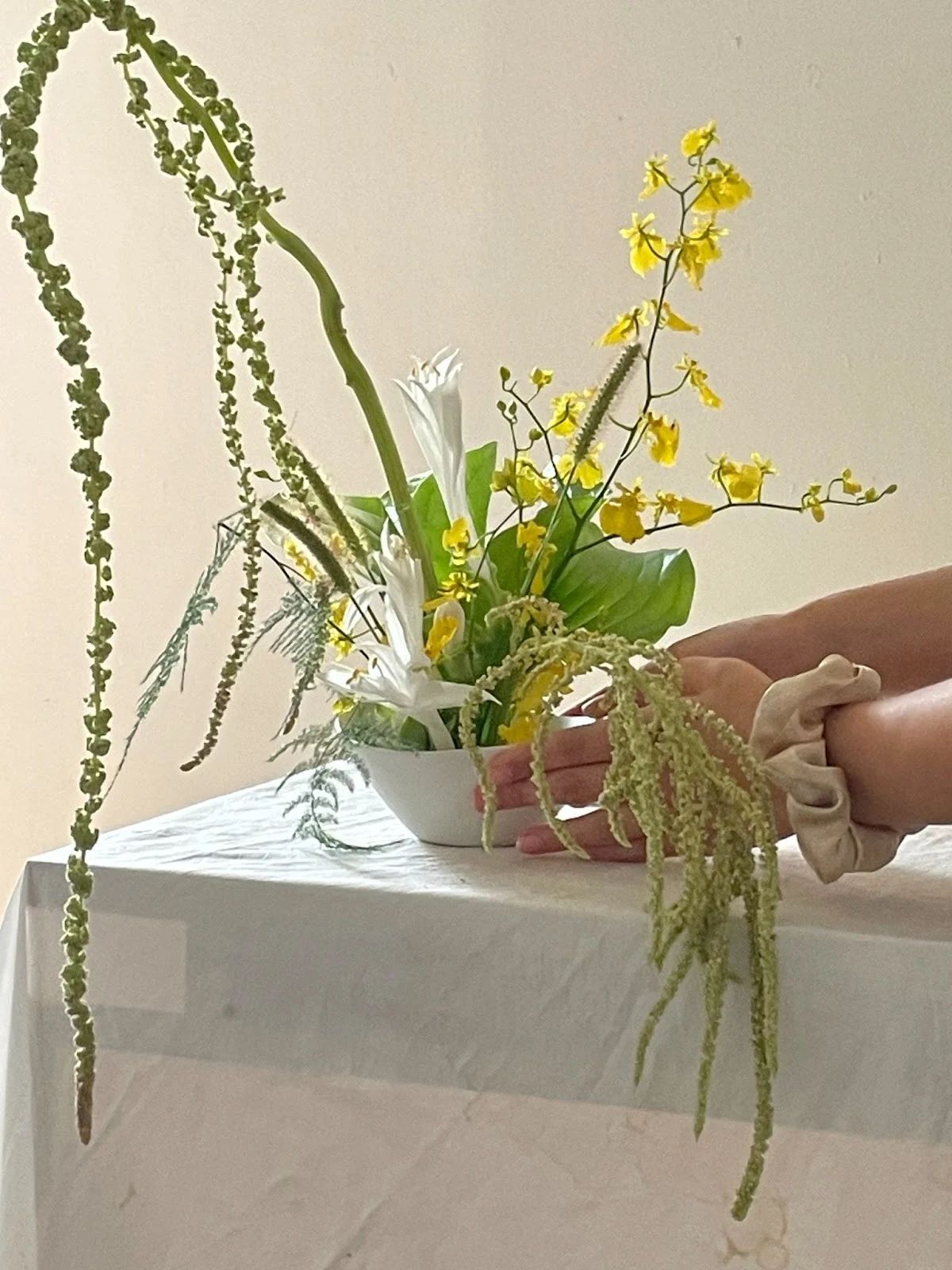 처음 해보는 침봉꽂이는 생각보다 어려웠고, 이제껏 해왔던 방식과 전혀 다른 게 보였다. 꽃을 많이 꽂을수록 풍부해지고 화려해지는 플로럴폼 꽃꽂이와 달리, 중요한 선을 제외한 나머지는 빼고 비워내는 작업의 반복이었다. 그동안의 플라워클래스에서는 준비된 소재와 꽃이 아까워 최대한 다 활용하고 얼굴이 큰 꽃도 과감하게 사용한 나였기에, 더 어렵게 느껴진 작업일지도 모른다.