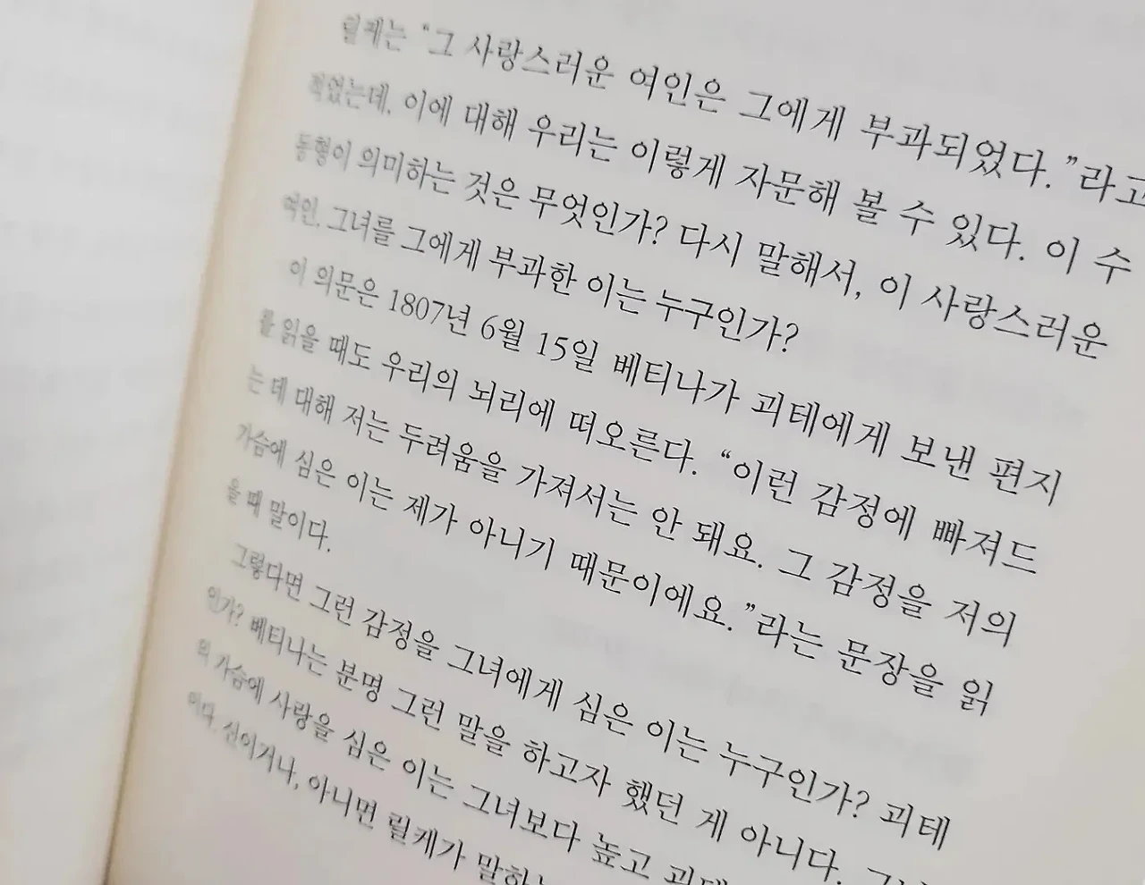 아가페 사랑이 아닌 에로스 사랑만이 연인의 사랑이라 보는 감정주의자들이 넘치는 이 시대에 사랑을 이야기하기란 쉽지 않다. 사랑할 때 중요한 건 사랑의 대상이라 말하는 아녜스, 사랑은 사랑일 뿐이기에 사랑하느냐 하지 않느냐가 중요하다 말하는 로라의 논쟁은 현시대가 표방하는 사랑의 의미를 되새김질한다. 소설의 내용 중 괴테와 베티나의 영원의 소송에 참여한 릴케는 자신이 쓴 ‘말테의 수기’를 인용한다. “그에게 부과되었고, 그는 실패했다.” 이는 결국 누군가를 사랑함이란 본인이 선택하는 것이며 아녜스와 괴테가 말하는 사랑의 대상, 로라와 베티나가 말하는 사랑 그 자체에 관한 대립의 중요성은 결국 사랑하는 감정에 가치를 두고 있는 인간에게 있음을 밝히는 것이다.