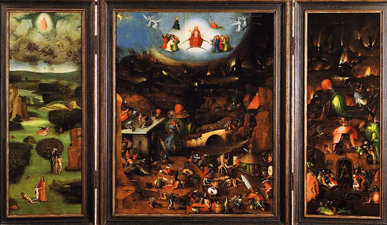 살아 숨 쉬는 인간이 직접 지옥을 경험해 볼 순 없겠지만 신이라는 존재가 시선을 돌린 공간인 지옥에서 겪는 고통은 말로 형용할 수 없을 것이다. 보스는 이러한 사실을 알리고 싶었던 것 같다. 그렇기에 좀 더 자극적인 면을 부각하여 죄의 결과를 묘사했고 인간들에게 경각심을 일깨워주기 위해 본인의 상상력을 가미했지 않았나 싶다. 특히 위에서도 언급한 '세속적인 쾌락의 동산'과 그의 또 다른 작품인 '최후의 심판'에서 그려진 죄의 형벌은 상당히 적나라하다. 마치 단테의 신곡에서 묘사된 지옥을 떠올리게 하며 아마 보스 역시 단테의 영향을 받았을 것이라 예상된다.
