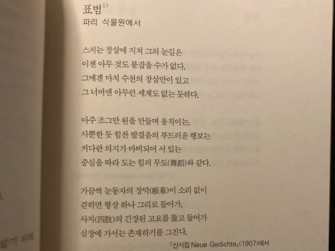물론 'Insomnia' 같은 영화처럼 악역으로 나온 적도 있지만 대체로 선한 이미지의 로빈 윌리엄스는 이 영화에서 역시 그의 부드러움을 여실히 보여준다. 허나 로빈 윌리엄스와 로버트 드 니로의 열연만큼 필자가 이 영화에서 가장 인상 깊었던 부분은 따로 있다. 바로 라이너 마리아 릴케의 ‘표범’이라는 사물시가 읊어졌을 때다. 어쩔 수 없는 문학 선망인으로서 릴케의 이름이 들리자마자 새벽의 피곤함은 가셨고 영화를 다 본 후, 릴케 시집을 꺼내 읽어 영화를 보며 느꼈던 감정을 되새김질했다.