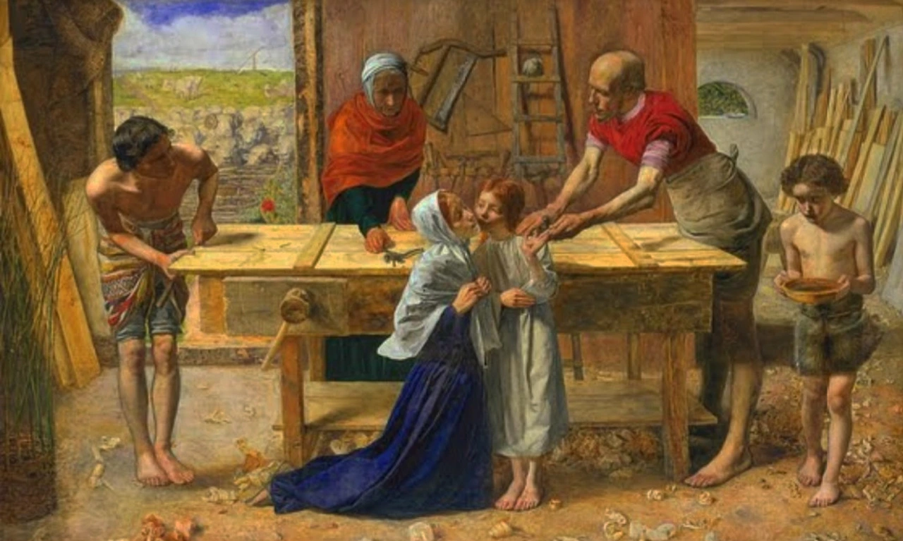 마지막 그림은 '부모의 집에 있는 예수(목수 작업장의 그리스도)'라는 작품이다. 밀레이가 이 작품을 발표했을 때 성스러운 예수의 가족을 일반 인간의 모습과 별반 다를 바 없이 그렸다 해서 많은 비난을 받았다. 신성모독적이라는 비난과 함께 화풍이 너무 중세적이다는 비판 또한 받았다. 이 같은 비판은 라파엘 전파 화가들에게 늘 따라오는 것이었는데 르네상스의 화풍이 메인 스트림인 이상 르네상스 이전 시대인 중세의 화풍은 보기 좋지 않으며, 같은 맥락으로 라파엘 전파 스타일은 퇴보되었단 내용의 비판이었다.