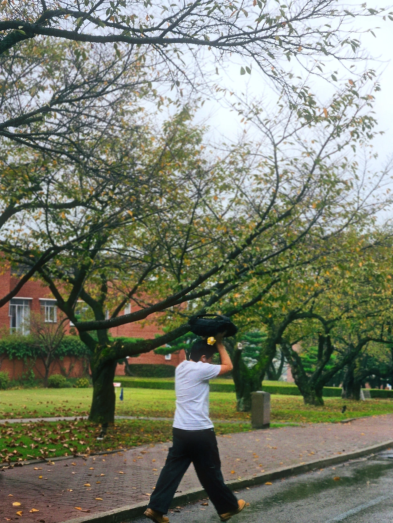 가방 하나로 쏟아지는 하늘을 가린 채