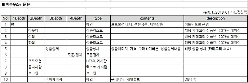 웹사이트의 구조를 정리하고, 그 구조 속에 어떤 정보가 들어가 있는지 표로 정리하는 문서입니다.