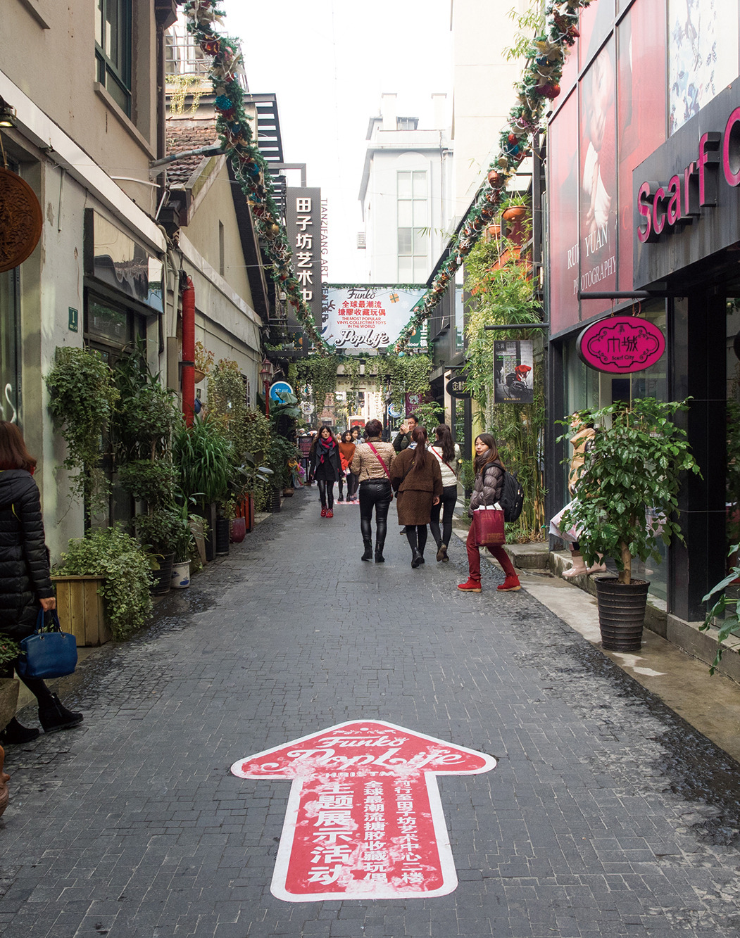 프랑스 옛 조계에 만들어진 또 하나의 명소 티엔쯔팡을 이야기하기 전에 상하이 고유의 건축양식인 스쿠먼에 대해 짚고 넘어가자. 19세기 개항 이후 인구가 폭발적으로 늘어나자 이들을 수용하기 위해 고안된 스쿠먼 가옥은 동서양 스타일이 결합된 독특한 외관이 특징이다. 문틀을 돌로 만든 데에서 스쿠먼(石庫門)이라는 이름이 붙었는데, 대개 화강암 문틀에 나무로 된 문을 달고 문틀 위에 유럽식 장식을 새겼다. 연립주택 형식으로 다닥다닥 붙여지어 서양 건물처럼 보인다. 티엔쯔팡은 바로 이런 스쿠먼 가옥과 공장이 밀집한 지역에 만들어진 예술지구다. 좁디 좁은 미로 같은 골목을 따라 공방과 갤러리, 디자인 숍, 기념품 가게가 오밀조밀 이어지고 카페, 초콜릿 가게, 캔디 숍 등도 즐비해 한나절 천천히 둘러보며 즐기기에 좋다. 이런 분위기는 누구에게나 매력적으로 다가오는지라 주말에 찾는다면 좁은 골목길에서 서로 어깨를 부딪히며 떠밀려 다니는 것쯤은 감수해야 한다. 신티엔디의 스쿠먼과 티엔쯔팡의 그것은 어떻게 다를까? 신티엔디의 그것은 본래 있던 옛 건물을 철거한 후 매끈하게 새로 지어 올렸고 티엔쯔팡은 옛 건물을 그대로 활용한 것이다.