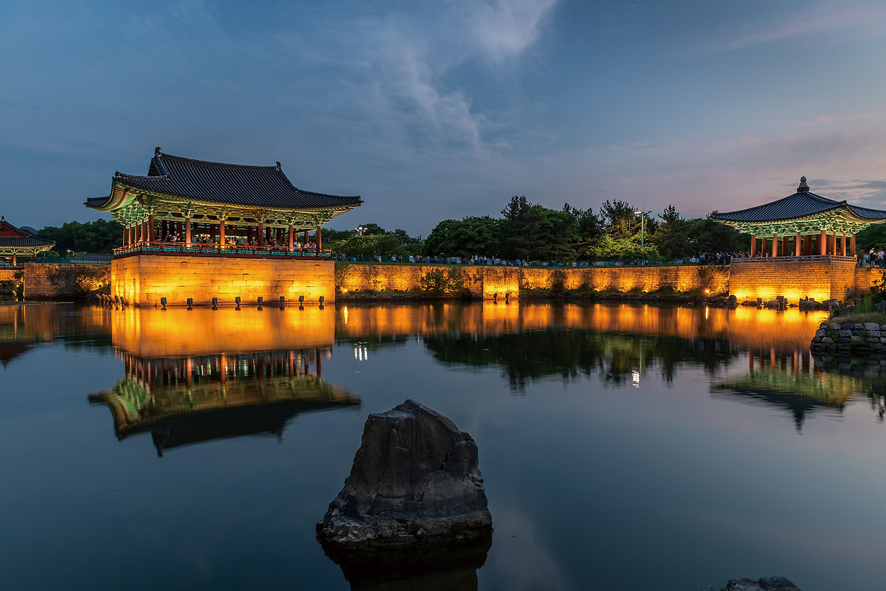 경주의 밤은 달빛이 깔려야 어울린다. 그에 더해 불국사의 종소리라도 들린다면 천년 고도를 떠올리기엔 더할 나위 없다. 천 년의 세월을 고스란히 담고 지나온 시간의 아름다움을 지키며 사는 도시, 경주에 밤이 내리면 낮과는 또 다른 아름다움이 얼굴을 내민다. 천년고도의 아름다운 야경을 품은 대표적인 곳은 동궁과 월지(옛이름 안압지)다. 물에 비친 전각의 밤 그림자가 달빛처럼 아름다워 기러기도 쉬어갔다는 이곳의 야경은 은은한 색상의 조명과 고요한 숲, 잔잔한 못이 함께 어우러져 가히 ‘신라의 달밤’이라 표현할 만하다. 동궁과 월지가 곱게 치장한 화려함을 품었다면 첨성대의 야경은 우아하고 고요하다. 국보 제31호로 지정된 첨성대는 동양에서 가장 오래된 천문대다. 낮에는 다소 작고 밋밋해 보이지만, 해가 진 후 조명이 더해지면 고아한 곡선이 부각되며 고풍스러운 아름다움을 발산한다.