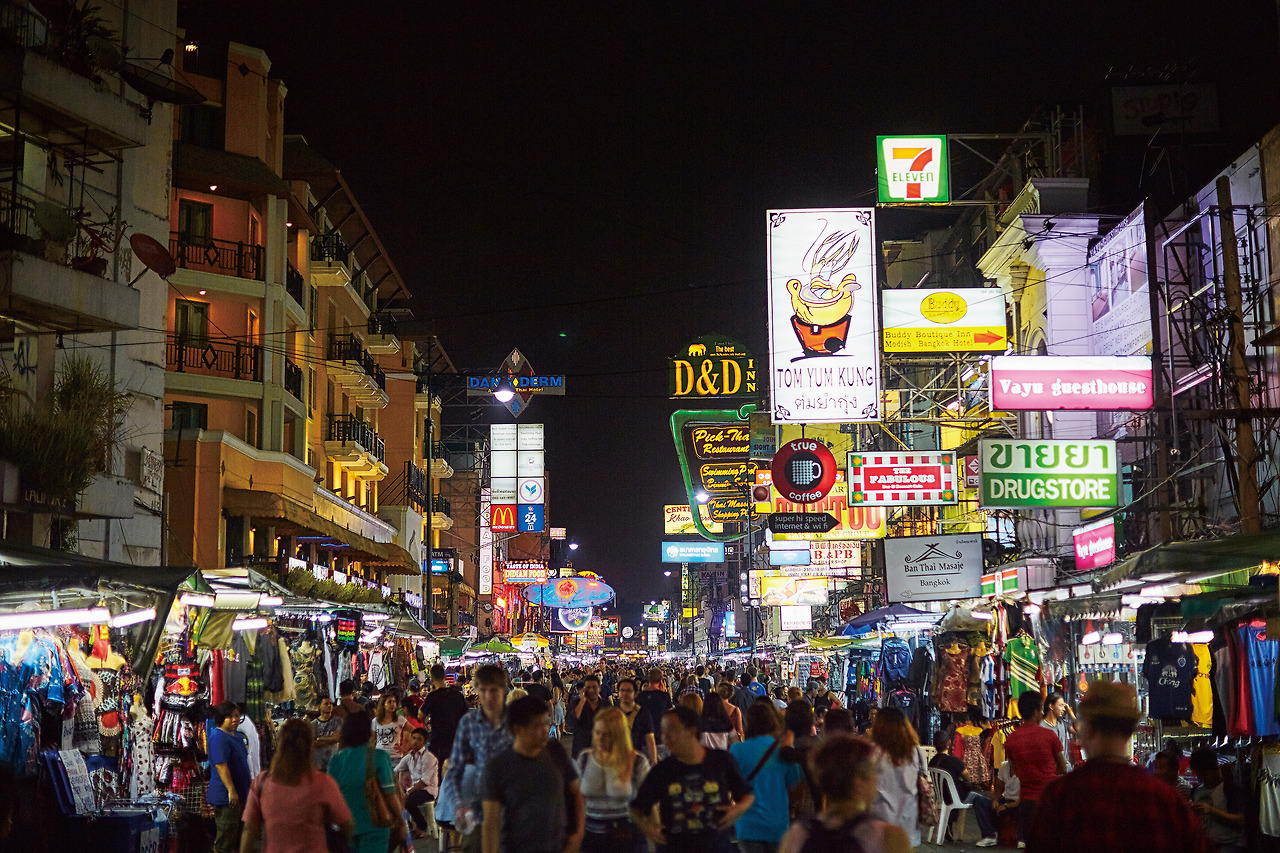 세계의 젊은 여행자들이 방콕에 열광하는 이유 중 하나가 카오산 로드일 것이다. 카오산 로드는 불과 300m 남짓한 짧은 거리이지만 저렴한 호텔과 게스트하우스, 관광안내소, 우체국, 카페와 바, 환전소, 값싼 먹을거리, 각종 투어를 알선하는 여행사 등 체류와 이동에 필요한 것들이 다 있다. 카오산 로드는 낮과 밤의 모습이 전혀 다르다. 낮엔 그저 평범한 방콕의 거리일 뿐이지만 밤이 되면 마치 금요일 밤의 홍대 앞 거리처럼 뜨겁다. 방콕을 잘 아는 이들은 카오산 로드의 명성이 예전만 못하다 입을 모아 말하지만 그래도 저렴하게 먹고, 마시고, 놀기에 아직 카오산 로드만한 곳을 찾기 어렵다. 거리 노점에서 파는 태국식 볶음국수 ‘팟타이’ 한 접시가 2천원이 채 안되고, 창(Chang)이나 싱하(Singha), 레오(Leo)와 같은 로컬 맥주 한 병을 곁들여도 5천원이면 야식 한끼가 거뜬히 해결되니 부담이 없다. 국적과 언어가 다른 여행자들끼리 스스럼없이 어울릴 수 있다는 점도 젊은 여행자들에게 매력적인 요소다. 차투착 주말시장과 차이나타운도 흥미롭다. 골동품에서 구제의류, 가짜 브랜드 시계, 공예품, 심지어 야생동물까지 거래되는 차투착 시장은 온갖 진귀한 풍물의 보고이자 방콕 최대의 명물 시장이다. 미로처럼 좁게 뒤엉킨 골목길에 식료품과 생활용품, 보석, 액세서리 가게가 촘촘히 이어지는 차이나타운도 재미있다.