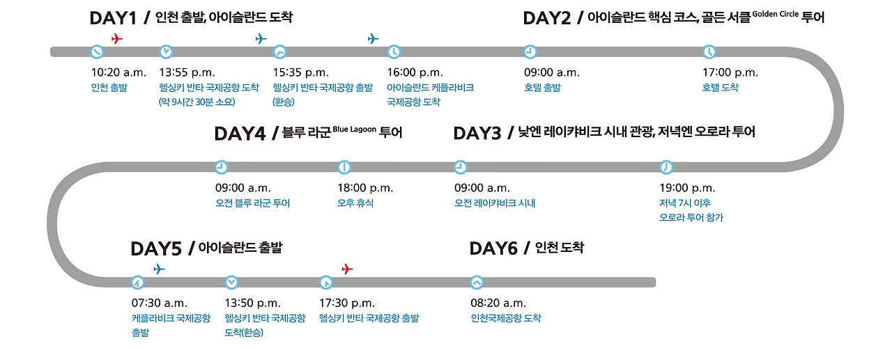 아이슬란드 여행의 핵심 3가지(골든 서클, 오로라, 블루 라군)를 모두 소화하고 귀국하는 날. 아이슬란드에서 헬싱키까지 3시간 20분, 헬싱키에서 인천까지 8시간 40분이 소요된다. 6일 일정이 가장 기본적이지만 만약 더 길게 다녀오고 싶다면 여행 출발 전 예약 단계에서 미리 추가 연장하자. 남부 아이슬란드의 빙하 호수인 요쿨살론(Jokulsarlon), 남쪽 해안도시인 비크(Vik) 인근의 레이니스피아라(Reynisfjara) 해변 등을 추천한다.