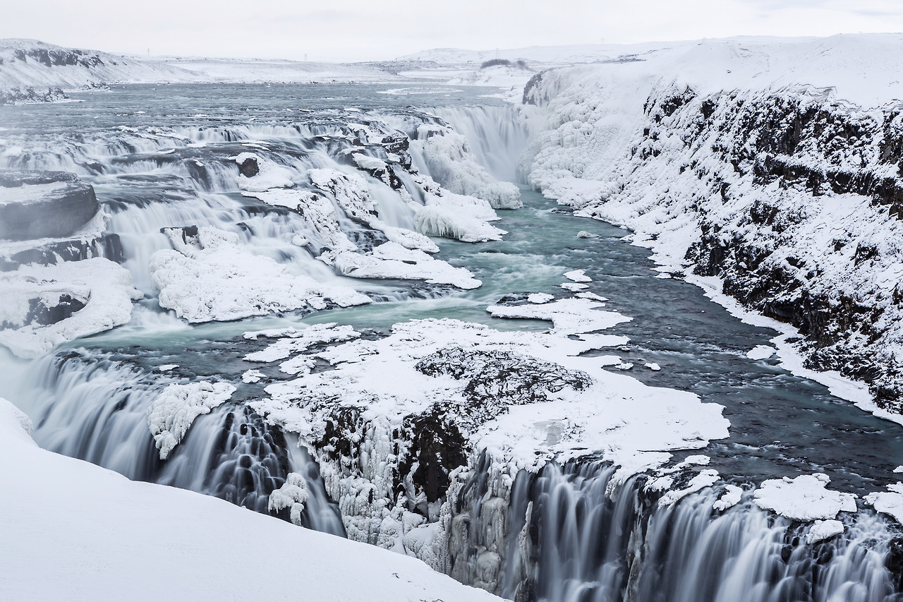 아이슬란드에서 가장 큰 폭포로 ‘금빛 폭포’라는 뜻이다. 폭포 사이로 무지개가 자주 생기기 때문에 이런 이름이 붙었다. 어마어마한 물줄기가 쏟아져 내리면서 물안개를 만들고 그 사이로 무지개가 떠오르는 것. 요즘 같은 겨울에는 물줄기 모양 그대로 얼어버린 거대한 얼음폭포가 장관을 이룬다.