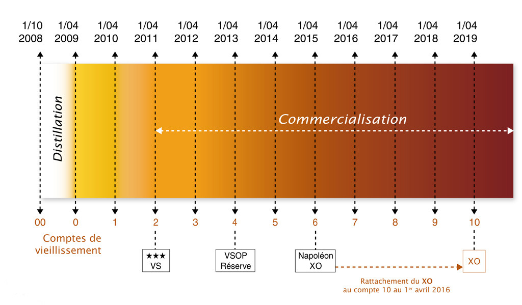 꼬냑의 나이를 꽁뜨(compte)라고 하는데, 매년 4월 1일을 기준으로 셈합니다. 이전 해에 생산한 화이트 와인을 오드비로 만들어 배럴에 저장하는 시기에 맞춘 듯 보입니다. 증류를 마친 첫 해가 '꽁뜨 0'이며, '꽁뜨 2'부터 꼬냑으로 생산이 가능합니다. 프랑스에서는 꼬냑 유통과 등급, 생산방법, 생산지 등을 BNIC(le Bureau National Interprofessionnel du Cognac, 국립꼬냑사무국)에서 법으로 제정해 엄격하게 관리하고 있습니다. 최근 BNIC에서는 XO의 등급을 2016년 4월부터 10년 이상 숙성한 코냑으로 수정하면서 꼬냑의 오드비 숙성 연도를 늘렸습니다. 10년 이상된 오드비를 첨가한 꼬냑의 프리미엄을 인정해 가치를 높였다고도 할 수 있겠지만, 그만큼 고가의 꼬냑 생산을 공식화한 것이라 생각합니다.